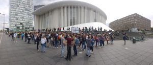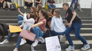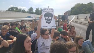 Dass die drohende Klimakatastrophe oder der Protest dagegen einfach ignoriert wird, wollen die Demonstranten nicht mehr hinnehmen: Darum gehört zur heutigen Aktion auch die teilweise Blockade der Verkehrsachse, auf der am Freitagnachmittag viele Menschen auf dem Weg von der Arbeit ins Wochenende sind: Manche im Bus oder in der Tram, viele sitzen aber auch alleine in Autos, die für sich schon fast Busgröße haben. Zahlreiche Menschen heben aufmunternd den Daumen, während sie an der Demonstration vorbeifahren. Ob sie sich überlegen, jetzt auch mal öfters den öffentlichen Transport zu nehmen, kann man leider nicht erfragen. Wirklich zum Erliegen kommt der Verkehr nicht: Alle paar Meter steht ein Polizist und achtet darauf, dass die Demo in „ihrer“ Spur bleibt.