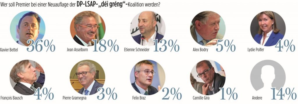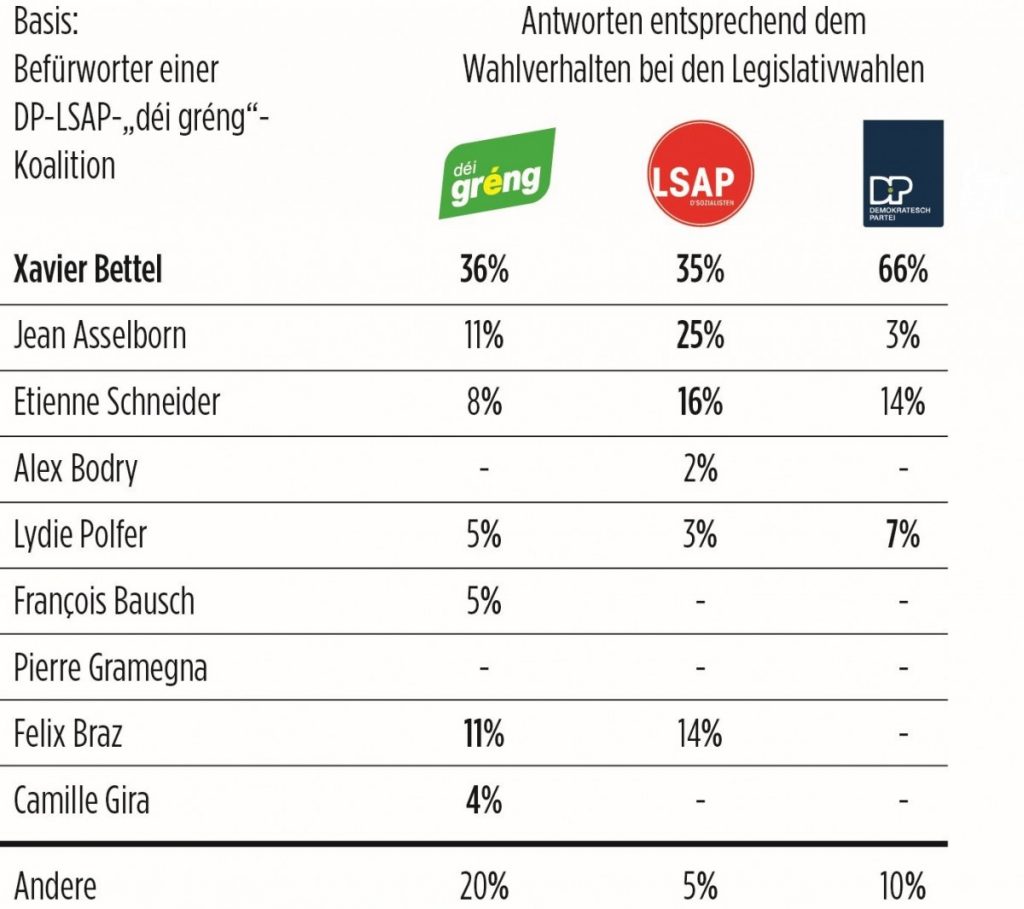 Dass der Mann bzw. die Frau aus der bevorzugten Partei auch als Premierministerkandidat punktet, sollte eigentlich selbstverständlich sein. Doch trifft diese banale Feststellung bei der LSAP und „déi gréng“ keineswegs zu. So verbannen die LSAP-Wähler Vizepremier- und Wirtschaftsminister Etienne Schneider (LSAP) auf Platz drei. Sie sähen lieber Bettel (35 Prozent) oder Außenminister Jean Asselborn (25 Prozent) als Schneider (16 Prozent) im Staatsministerium.