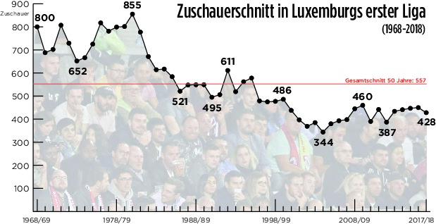 2017/18 kamen im Schnitt zwar 30 Zuschauer mehr als genau vor zehn Jahren, aber 120 weniger als vor 30 Jahren und immerhin 372 weniger als 1968/69, also vor 50 Jahren. 2004/05 wurden die wenigsten Zaungäste (344 im Schnitt) registriert, 1980/81 die meisten bei einem Schnitt von 855. Aber in der letzten Spielzeit kamen beispielsweise auch 84 Zuschauer mehr als in der Saison 2004/05, als die BGL Ligue bislang den absoluten Tiefpunkt in puncto Zuschauerschnitt erreicht hatte. Der reelle Schnitt von 1968/69 bis 2017/18 – also in den letzten 50 Jahren – liegt exakt bei 557.