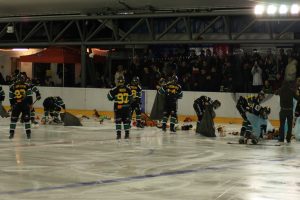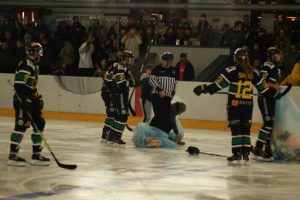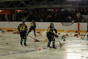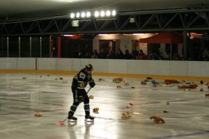 Die Knights wissen, dass sie sich auf ihre Fans verlassen können und ließen sie dann auch nicht lange warten. Es waren gerade einmal 52 Sekunden im ersten Drittel gespielt, da versenkte Benny Welter den Puck im gegnerischen Tor. Es folgte ein Plüschtier-Regen. Am Ende lagen ganze 333 Teddybären auf dem Eis. Die wurden erst einmal in großen Plastiksäcken weggeräumt, damit das Spiel fortgesetzt werden konnte.