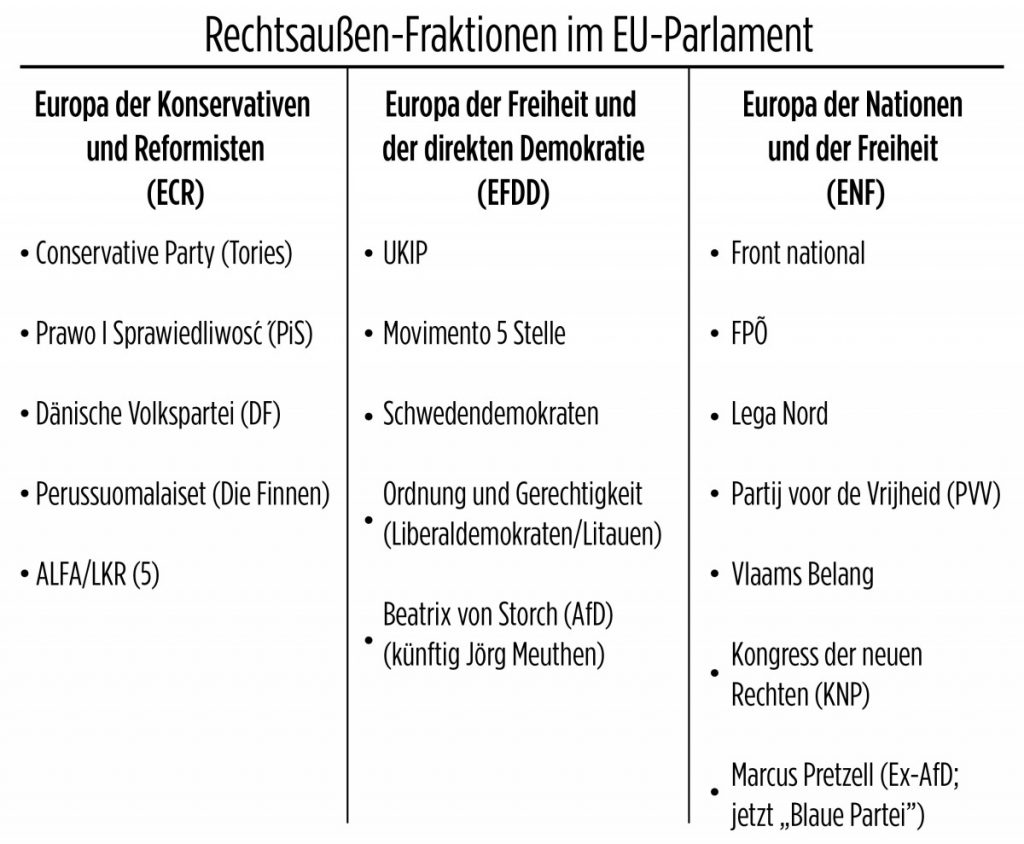 Die Realität sei aber eine andere. Es sei der neuen Rechten gelungen, alte Ideologien neu aufzubereiten und damit auch Arbeitnehmer wieder zu erreichen. Fremdenhass, oft Antisemitismus und neuerdings Islamfeindlichkeit sind die treibenden Kräfte. Die Bürger werden als Opfer dargestellt, die jeweiligen extrem rechten Parteien als ihre alleinigen Vertreter bzw. Retter. Sie würden sich nach außen gegen Eliten stellen; paradoxerweise würden ihre Politiker aber selbst zu diesen gehören (Millionäre, Professoren …). Die Ablehnung von Pluralitäten sei diesen Parteien gemein; sie reduzieren alle Probleme und Lösungen auf einen Nenner (heute das Volk, morgen die Rasse …), bewegten sich nahe am Nationalsozialismus. Das Volk brauche in dieser Ideologie keine Demokratie, lediglich sie als Fürsprecher …