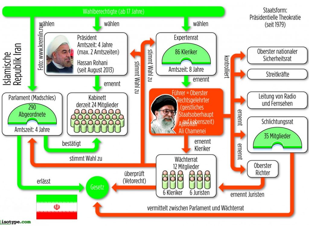 Wächterrat: Dieser Verfassungsrat prüft die Vereinbarkeit der verabschiedeten Gesetze mit Grundsätzen des islamischen Rechts. Bei allen Wahlen entscheidet er über die ideologische und religiöse Zuverlässigkeit von Kandidaten. Die zwölf Mitglieder des Rates werden je zur Hälfte vom geistlichen Führer und vom Parlament ernannt.