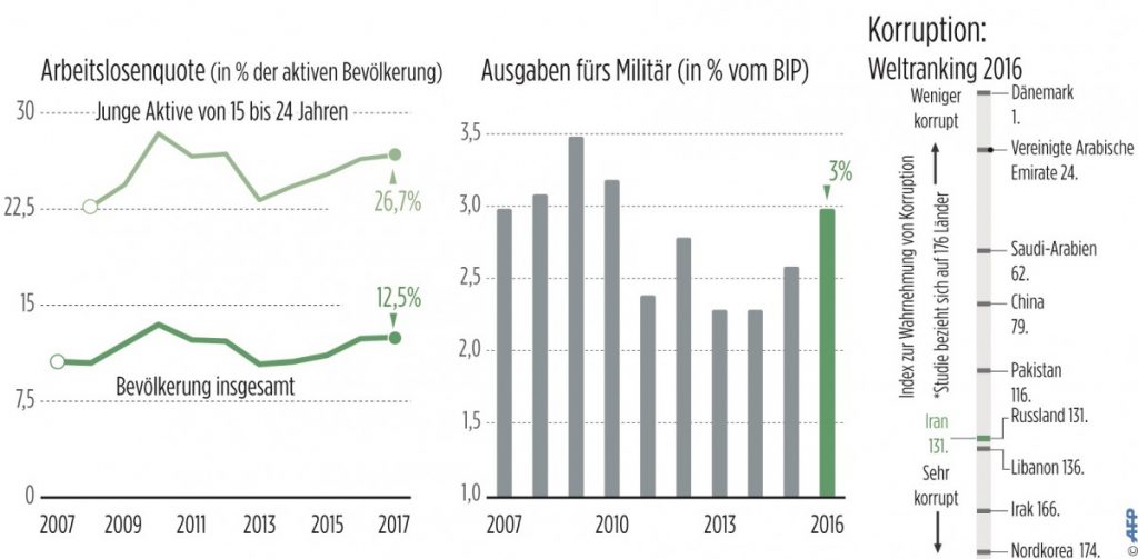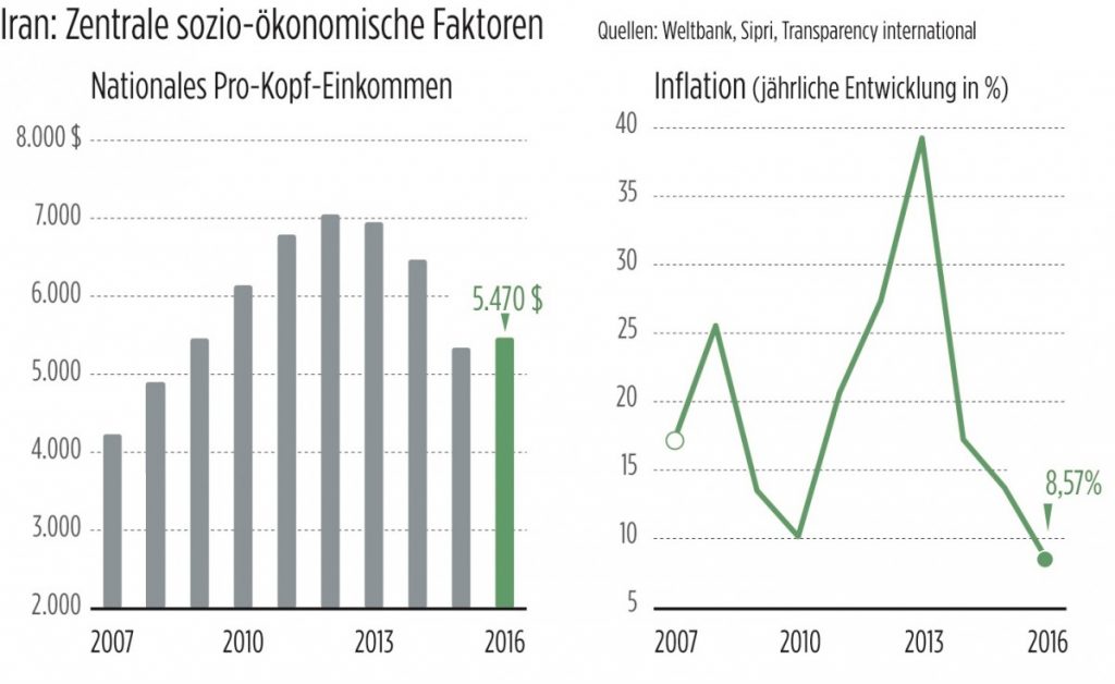 Hohe Arbeitslosigkeit und Preissteigerung sind zwei der wichtigsten Schlagwörter rund um Irans kränkelnde Wirtschaft. Das Ende der Sanktionen nach dem Nukleardeal hat den Iranern bislang keine Vorteile gebracht. Die Arbeitslosigkeit liegt bei 12,5 Prozent. Die Jugendarbeitslosigkeit beträgt fast 30 Prozent. Bis zum 20. März 2017 stieg das Bruttoinlandsprodukt (BIP) um 12,5 Prozent. Dies allerdings fast ausschließlich wegen des Anstiegs der Öl-Exporte. Auch der Blick auf die „wahrgenommene“ Korruption zeigt, ein Unwohlbefinden in der iranischen Bevölkerung. Die finanziellen Hilfen für die militärischen Partner im Ausland stoßen zudem auf sehr viel Unverständnis und haben teils zu rassistischen Ressentiments gegen Araber geführt.
