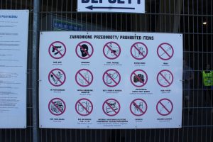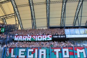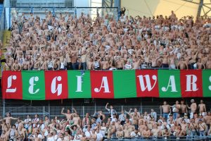 Derrière moi prennent place les fans de la capitale. Le secteur est séparé du reste du public et sous l’œil de nombreuses caméras de vidéosurveillance. Ils ne chantent pas, malgré l’ouverture du score du Legia dès la neuvième minute. Leurs compagnons de voyage subissent encore une fouille minutieuse et il faut attendre la demi-heure de jeu pour voir les derniers supporters du Legia arriver. C’est alors qu’ils commencent leur show. Le match des tribunes débute enfin avec un avantage pour le Legia. Dans les tribunes du stade les femmes et les enfants sont en force. Sous l’œil amusé des stewards, des enfants d’une dizaine d’année insultent le Legia.
