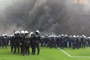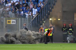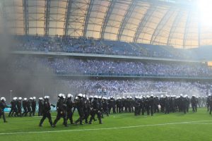 La deuxième mi-temps reprend, mais, les fans du Lech n’y croient plus, leurs chants faiblissent et on n’entend plus que les partisans du club de la capitale. D’ailleurs à la demi-heure de jeu, les ultras de Poznan enlèvent toutes les banderoles de leur tribune, puis ils affichent une banderole explicite: „Putain, c’en est trop“. De temps en temps ils insultent leurs rivaux et, à la 69e minute arrive l’impensable: le deuxième but du Legia. C’est le signal qui déclenche les hostilités. Des fumigènes noirs sont jetés sur la pelouse. Rapidement, l’arbitre arrête le match. Cela dure quelques minutes, puis, quelques supporters du Lech Poznan pénètrent sur la pelouse. Le directeur de jeu renvoie définitivement les équipes aux vestiaires alors que les policiers anti-émeutes pénètrent sur la pelouse. Ils font reculer les fans locaux qui en réponse retournent dans leur tribune.