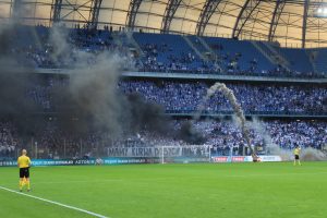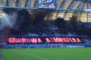Lorsque les équipes pénètrent sur la pelouse, le bas de la tribune sud, celle qui abrite les ultras locaux, se pare d’un voile avec un slogan explicite: „atmosphère de mort“. Les joueurs posent pour la photo, puis chacune des deux équipes se rassemble pour se motiver. C’est alors que des fumigènes noirs et blancs sont allumés au-dessus du message, alors que les supporters de Poznan tendent leurs écharpes. Puis l’ambiance démarre. Les chants ne sont pas mélodieux comme dans les stades du Sud de l’Europe, mais l’ambiance est intimidante. L’un des leaders de la tribune sud lance les chants sur un podium, accompagné par un ultra qui frappe en cadence sur sa grosse caisse.