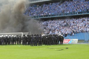 Je me dirige vers l’entrée, et, pour pénétrer sur la pelouse avec les autres photographes, je dois passer par une entrée située sous le secteur adverse. Je traverse alors un couloir où une centaine de policier se préparent: tenue anti-émeute, casque, cagoule et même des fusils (pour tirer des balles en caoutchouc). La scène me fait froid dans le dos. Heureusement, la beauté du stade me permet d’oublier cela. Ce soir, il seront plus de 30.000 spectateurs dans les tribunes.