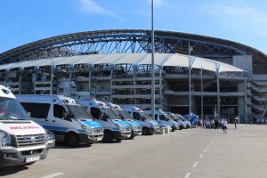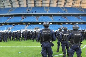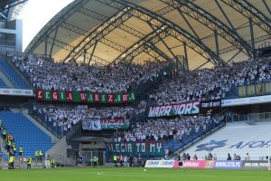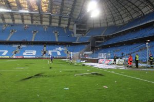 De l’extérieur, le stade est assez impressionnant. Sa capacité est de 45.000 places et il fut complètement rénové à l’occasion de l’Euro 2016. La situation semble pourtant calme pour ce sommet du championnat. Il faut dire que les 2.000 partisans du Legia voyagent avec deux trains spéciaux et les mesures de sécurité sont impressionnantes. Ils sont sous bonne garde dans un parking séparé et un tunnel les amène directement dans le secteur du stade qui leur est réservé.