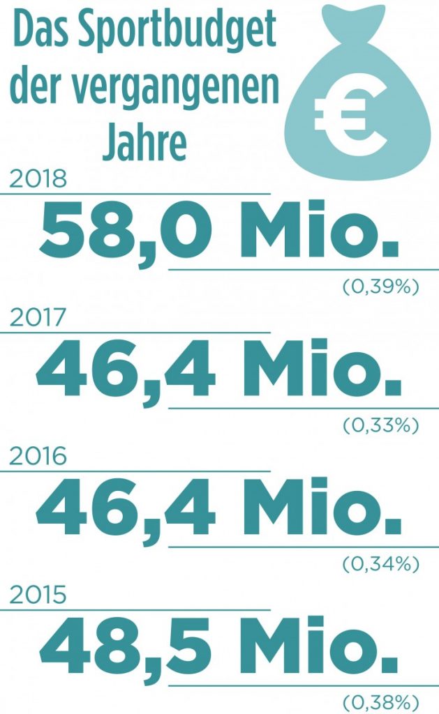 Ohne Geld geht nichts, auch im Sport. Das Budget des Sportministeriums zählt traditionell zu den kleinsten im Staatshaushalt. Dieses Jahr liegen die Ausgaben bei knapp 58 Millionen Euro, was 0,39 Prozent der Gesamtausgaben entspricht.