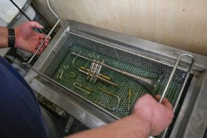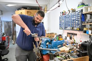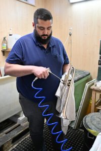 „Sie sehen ja, der Platz ist begrenzt“, sagt er. Hinter der kleinen Theke befindet sich ein schmaler Verkaufsbereich, doch der Großteil des Lokals ist Werkstatt. Vier Arbeitsplätze, dicht eingerahmt von Werkzeugen, Materialien und Ersatzteilen. Was für Außenstehende unübersichtlich wirken mag, funktioniert für das Duo präzise – jeder Griff sitzt. In dem einen Hinterraum steht die Poliermaschine, gerade groß genug für zwei Personen. Im anderen das Ultraschallbad, rund 5.000 Euro teuer. Eine größere Version für 10.000 Euro sei bereits bestellt, „mit Aufzug für die großen Instrumente“, sagt Vervloessem und lächelt.