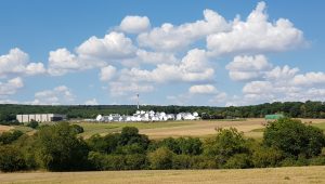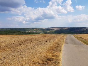 Spätestens in Filsdorf aber haben sich die Schmerzen gelohnt, denn vom neu asphaltierten Feldweg hat man einen prima Blick aufs Minett und auf die vier Kühltürme von Cattenom. Wellig bleibt es aber allemal, erst als die für den „Vëlosummer 2020“ gesperrte Abfahrt in Richtung Syren erreicht ist, flacht das Terrain ab. Hier laufen die Routen D und E parallel in Richtung Moutfort und man kann es an der Brichermillen vorbei so richtig laufen lassen. Weiter geht es mit toll markierten Rad- und Feldwegen („Mat Respekt an Héiflechkeet ass genuch Plaz um Wee“) in Richtung Schüttringen. Kurz vor Übersyren kommt bereits die nächste für den Autoverkehr gesperrte Straße am Naturreservat „Schlammwiss“ entlang nach Mensdorf. Die hat vor kurzem erst einen neuen Belag erhalten, es fährt sich darauf wie auf einem Teppich.