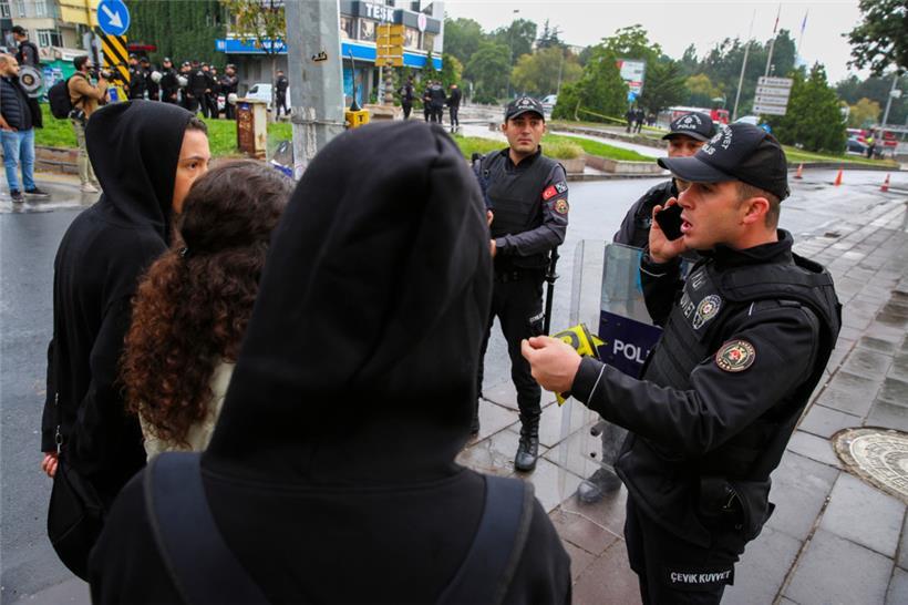 Türkische Polizisten und Sicherheitskräfte riegeln ein Gebiet nach einer Explosion in Ankara ab. Ein Selbstmordattentäter hat am Sonntag im Herzen der türkischen Hauptstadt Ankara einen Sprengsatz gezündet, wenige Stunden bevor das Parlament nach einer Sommerpause wieder öffnen sollte. Ein zweiter Angreifer wurde bei einem Feuergefecht mit der Polizei getötet. Foto: Ali Unal/AP