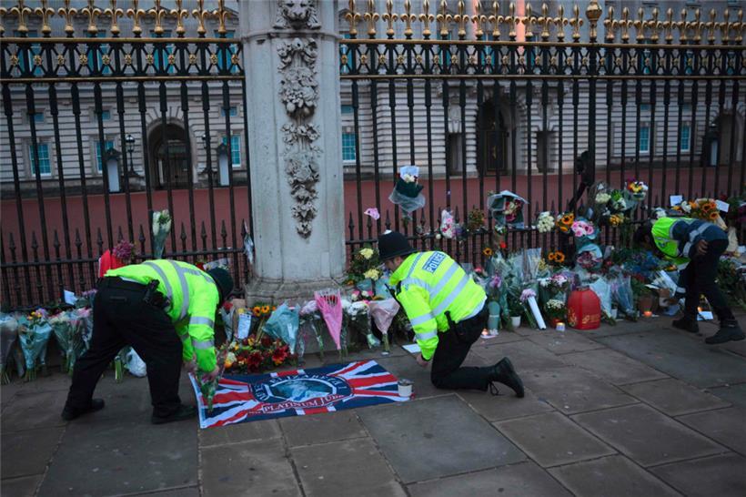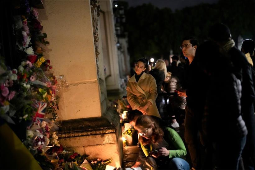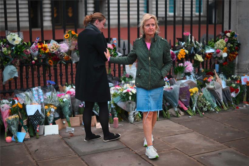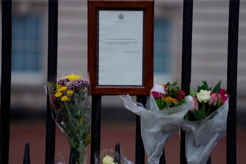 Menschen legen am Freitag, einen Tag nach dem Tod von Königin Elisabeth II., Blumen vor dem Buckingham-Palast in London ab Foto: AFP