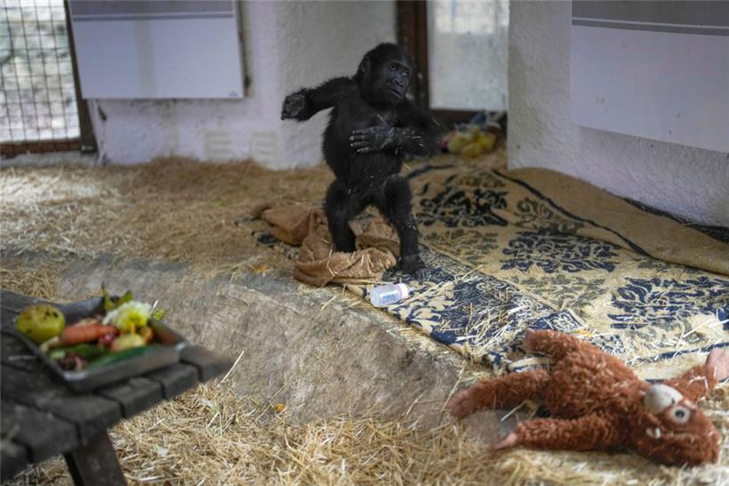 Zeytin, ein fünf Monate altes Gorillakind, das am Istanbuler Flughafen gerettet wurde, in einem speziell eingerichteten Bereich eines Zoos in Istanbul Foto: dpa/AP/Khalil Hamra