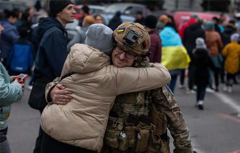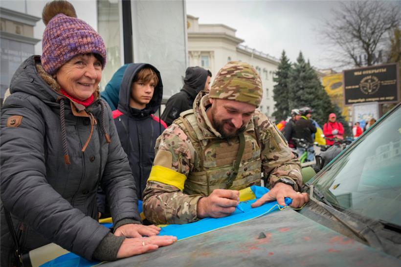 Ein Mädchen, das eine ukrainische Nationalfahne trägt, tauscht mit einem ukrainischen Soldaten Blumen aus. Der Rückzug der Russen aus Cherson war ein Meilenstein in der ukrainischen Gegenwehr gegen den Einmarsch Moskaus vor fast neun Monaten. Foto: Efrem Lukatsky/AP/dpa