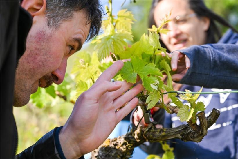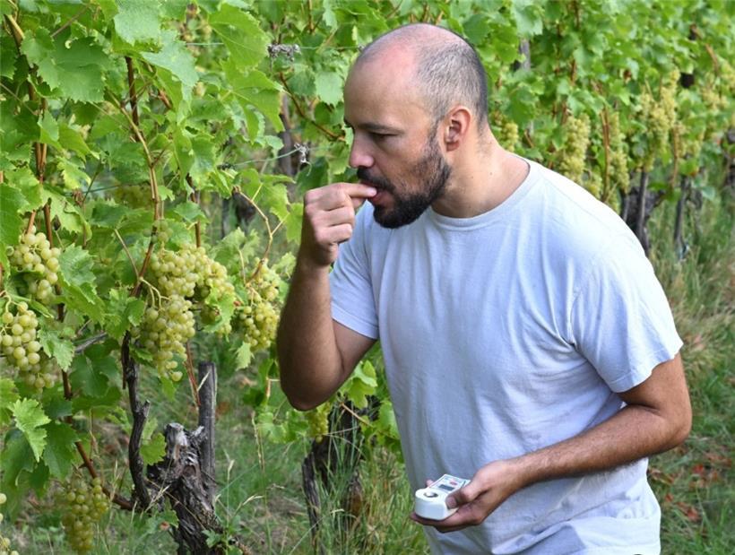 Zeit für eine Kostprobe: Ende August war die Arbeit getan. Nun wollten wir herausfinden, wann der optimale Lesezeitpunkt für unsere Trauben ist. Wir haben Proben im Labor des „Institut viti-vinicole“ untersuchen lassen und uns mit Önologe Jean Cao durch die einzelnen Reihen probiert. Sein Fazit: „Ihr seid nicht mehr weit vom optimalen Zeitpunkt entfernt.“