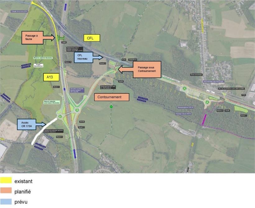 BIGS und Méco unterstützen nach eigenen Angaben „leidenschaftlich und mit aller Kraft“ jede Naturschutzmaßnahme – eigentlich. Doch die Wildbrücke würde an dieser Stelle keinen Sinn ergeben. Denn das Wild würde sich wegen der geplanten Umgehungsstraße schlussendlich in einer Sackgasse befinden. Durch das „Contournement“ wird der Grünstreifen auf der anderen Seite der A13 durchschnitten. Zudem wird durch das geplante Eisenbahndreieck Differdingen-Bascharage die vorhandene Naturfläche noch weiter reduziert.