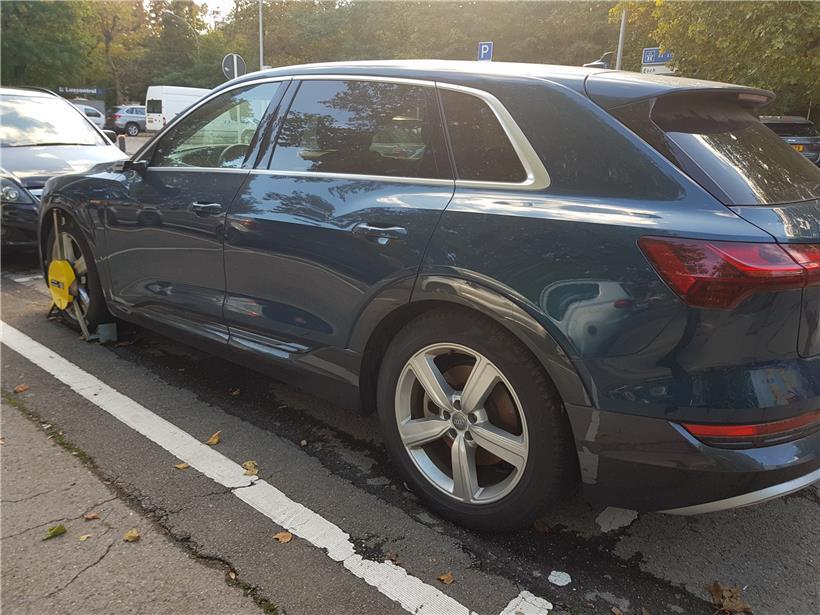 Auf dem Parkplatz Terres Rouges kamen vor rund einem Jahr sechs Stellplätze hinzu. Zu oft war es hier in unmittelbarer Nähe zum Konservatorium mit seinen rund 1.000 Musikschülern zu Park-Engpässen gekommen. Zumal auch die „Annexe Terres Rouges“ der Brill-Schule hier steht. Einstweilen jedenfalls sind sechs Plätze mit Autos besetzt, die mit einer gelben Kralle „dekoriert“ sind. Neben einiger schrottreifer Fahrzeuge neuerdings auch ein Audi E-Tron 55 Quattro, Neupreis ab 70.000 Euro.
