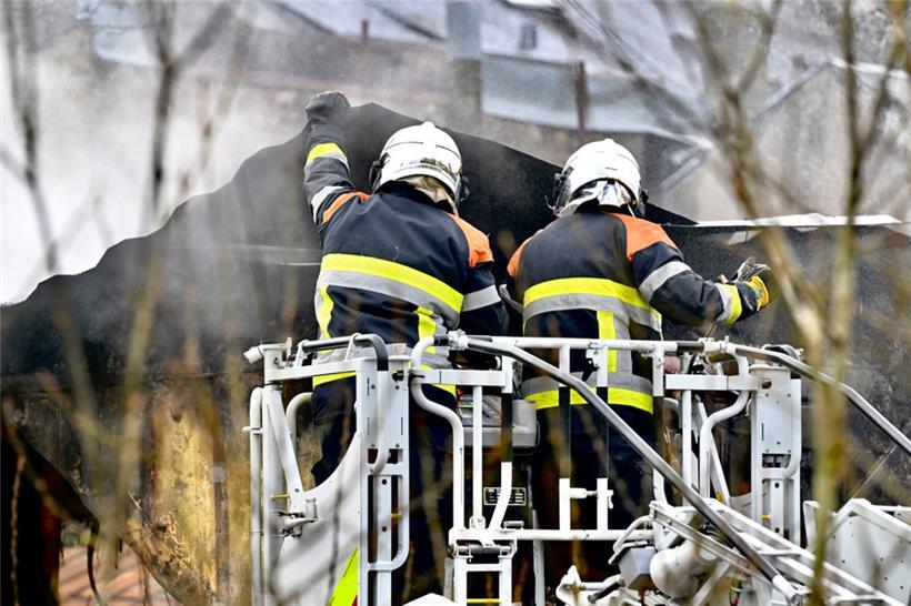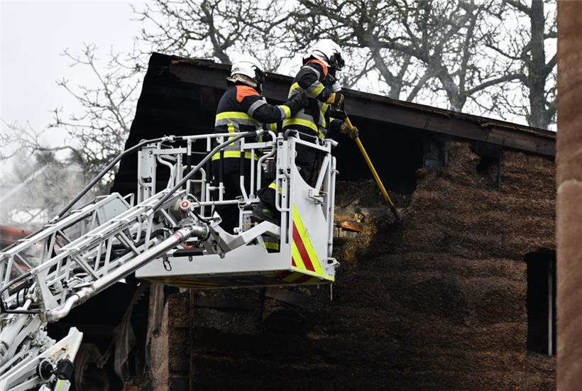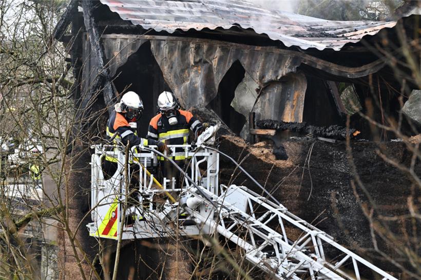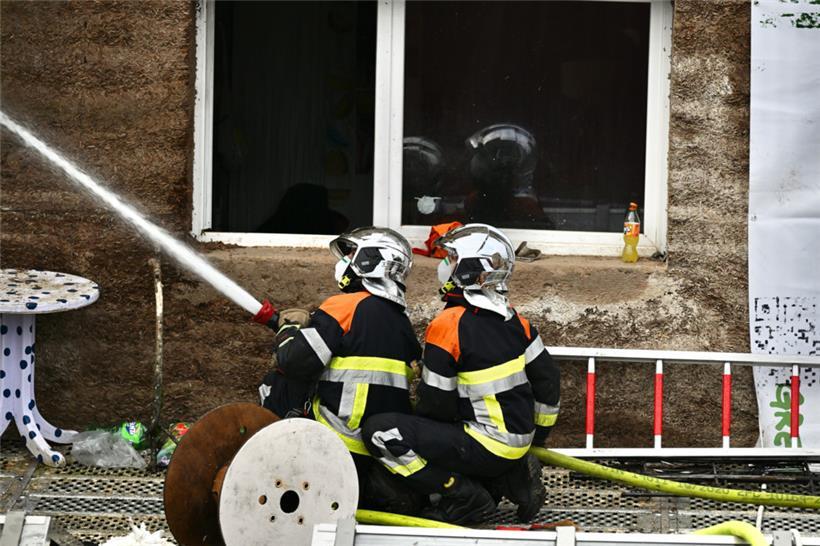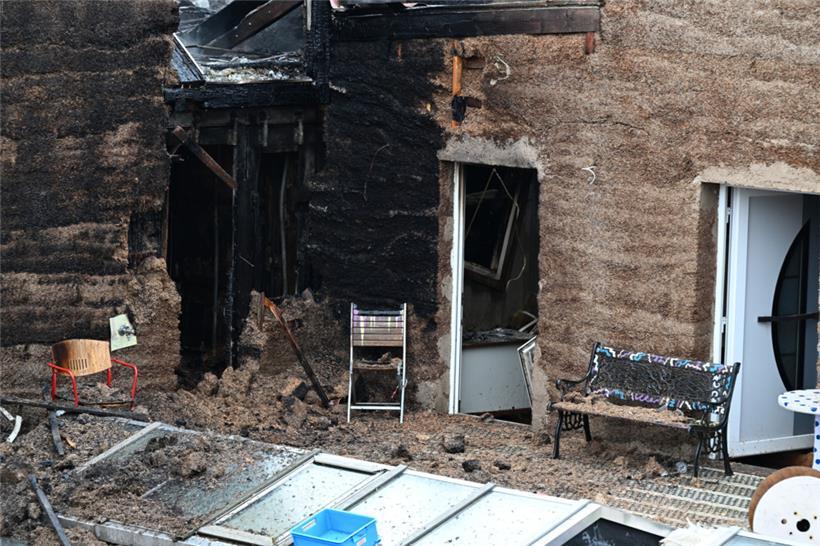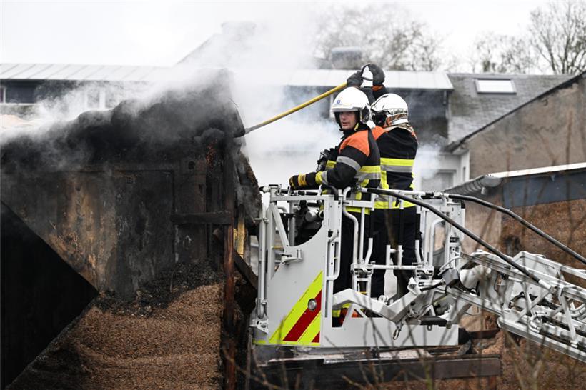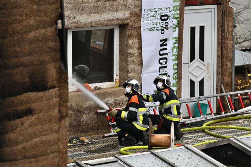 Das Gebäude ist laut Einsatzleiter, obwohl es innen komplett abgebrannt ist, stabil. „Das Feuer sickert allerdings noch weiter in der Fassade“, erklärt der Feuerwehrmann. Aus dem Mauerwerk steigen gegen 10.30 Uhr noch ein paar Rauchschwaden hervor. Die Wand besteht aus Lehm und Holzschnippeln, deswegen sickert das weiter. „Wir müssen das jetzt abtragen und dann gibt es weiter keine Gefahr“, sagt der Einsatzleiter. Das Baumaterial sei jedenfalls eher unüblich – es isoliere zwar gut, aber sei beim Feuer „nicht von Vorteil“. Am späten Morgen wartete das CGDIS noch auf einen Experten, um sich die Situation genauer anzuschauen und Beweise zu sichern. „Wenn er sein Okay gibt, dann können wir den Rest der Mauer abbauen, damit wir den Rauch loswerden.“