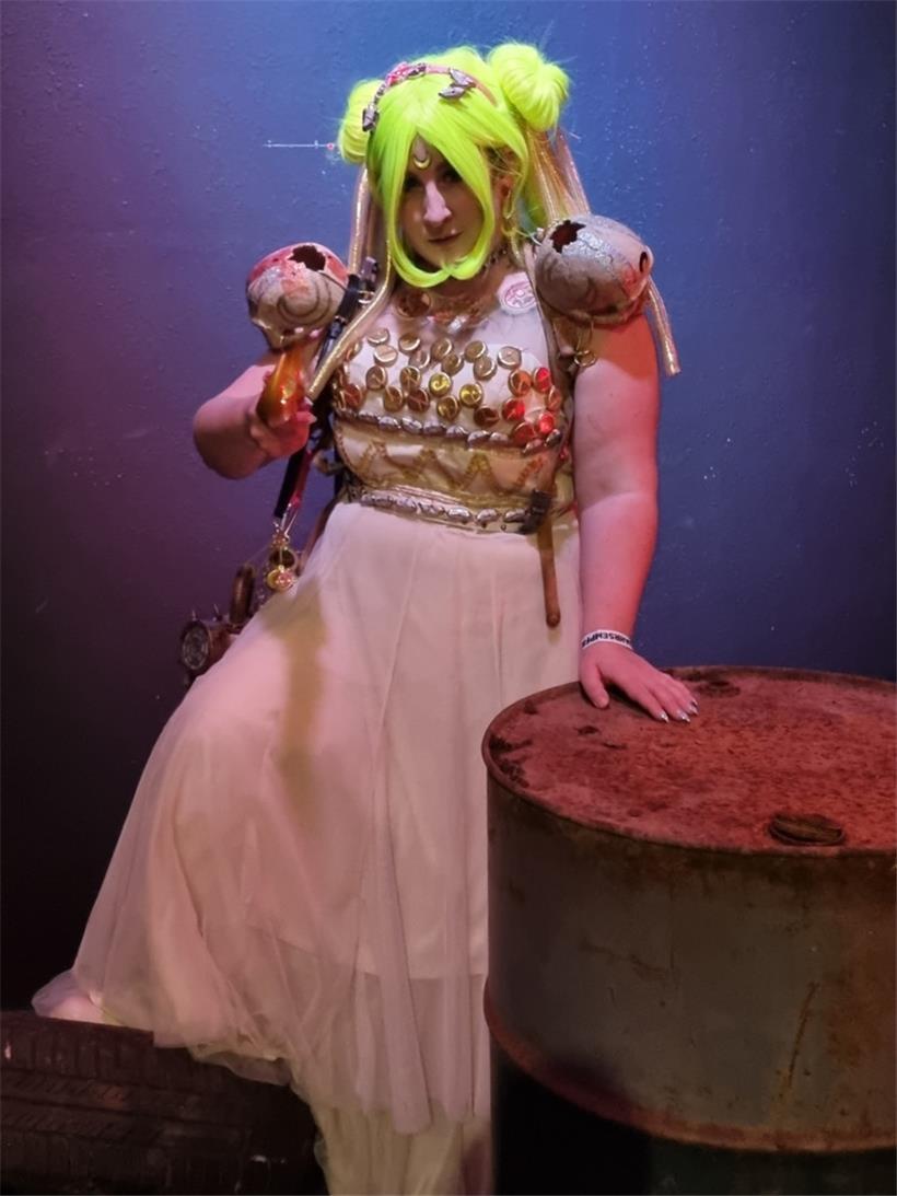 2017 hat sie das Cosplay-Fieber zum ersten Mal gepackt. Seitdem hat sie bereits viele Charaktere dargestellt und an zahlreichen Conventions teilgenommen. Morticia Addams aus der „Addams Family“, John Snow aus „Game of Thrones“, Eddie Munson aus „Stranger Things“ und Trinity aus „Matrix“ sind nur einige der Figuren, in deren Rolle sie bereits geschlüpft ist. „Ende März habe ich zum ersten Mal an einem Cosplay-Wettbewerb teilgenommen“, erzählt sie. Dort trat sie als Prinzessin Serenity aus „Sailor Moon“ auf. „Ich mache so viel selber, wie ich kann, arbeite aber auch gerne mit Secondhand-Kleidungsstücken, die ich dann umnähe oder verziere“, sagt die begeisterte Cosplayerin, die sich das Nähen selber beigebracht hat. „Das bereitet mir am meisten Spaß: Details hinzufügen, hier und da eine Perle draufnähen, aber auch Waffen aus Worbla (thermoplastischer Kunststoff, der sich mittels Hitze verformen lässt, Anm. d. Red.) herstellen.“