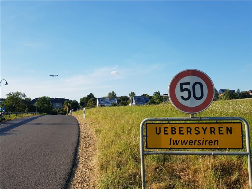 Spätestens in Filsdorf aber haben sich die Schmerzen gelohnt, denn vom neu asphaltierten Feldweg hat man einen prima Blick aufs Minett und auf die vier Kühltürme von Cattenom. Wellig bleibt es aber allemal, erst als die für den „Vëlosummer 2020“ gesperrte Abfahrt in Richtung Syren erreicht ist, flacht das Terrain ab. Hier laufen die Routen D und E parallel in Richtung Moutfort und man kann es an der Brichermillen vorbei so richtig laufen lassen. Weiter geht es mit toll markierten Rad- und Feldwegen („Mat Respekt an Héiflechkeet ass genuch Plaz um Wee“) in Richtung Schüttringen. Kurz vor Übersyren kommt bereits die nächste für den Autoverkehr gesperrte Straße am Naturreservat „Schlammwiss“ entlang nach Mensdorf. Die hat vor kurzem erst einen neuen Belag erhalten, es fährt sich darauf wie auf einem Teppich.
