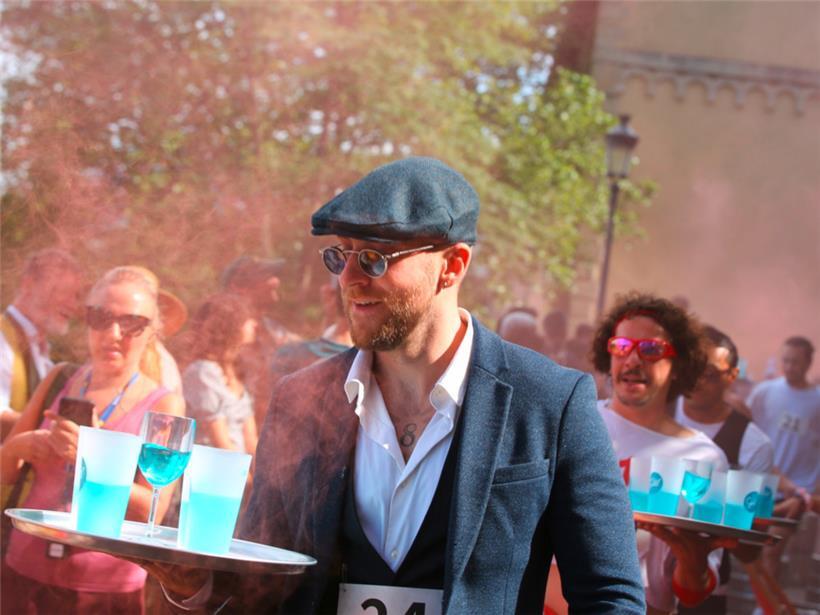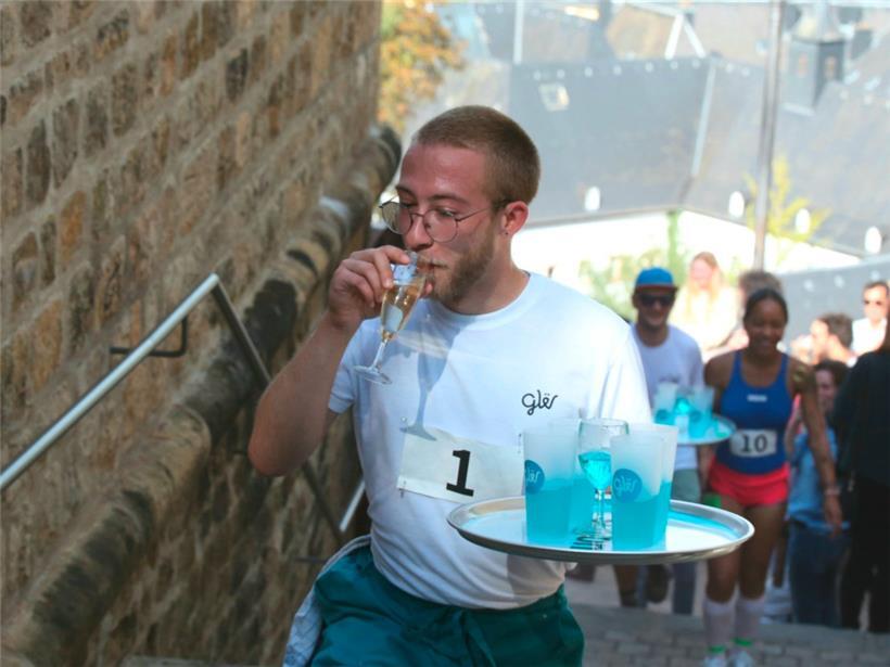 Nachdem sich alle Teilnehmer am Start in der „Montée du Grund“ mit seinem Serviertablett eingefunden hatten – manche in kreativen Kostümen, da Verkleidungen ausdrücklich erwünscht waren –, fiel der Startschuss. Bis zum Ausbruch der ersten Schweißtropfen dauerte es im steilen Aufstieg Richtung „Corniche“ nicht lange, denn nach wenigen Metern ging es die Treppen hoch. Oben auf der „Corniche“ gab es einen Erfrischungsshot für zwischendurch. Die Verschnaufpause war aber nur von kurzer Dauer, denn schon stand der Hindernislauf zwischen Tischen, Stühlen, Liegestühlen und leeren Bierfässern an. Die Zuschauer setzten indes noch einen darauf – immerhin wollte jeder das beste Foto machen. Bis zum Ziel war es noch weit, denn die Jury setzte drei Runden an.