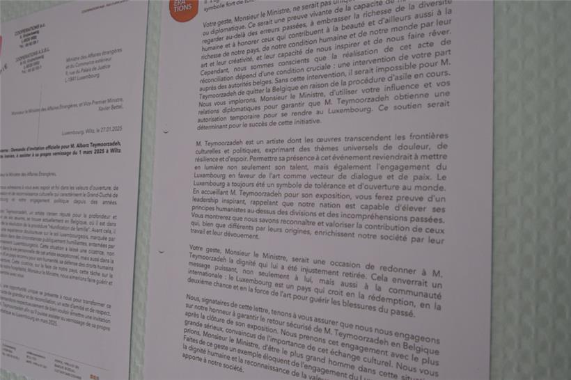 „Monsieur le Ministre des Affaires étrangères, nous nous adressons à vous avec espoir et foi dans les valeurs d’ouverture, de compassion et de reconnaissance culturelle qui caractérisent le Grand-Duché de Luxembourg et votre engagement politique depuis des années.“ So lautet der erste Satz eines Briefes, der an diesem Samstag direkt neben der Eingangstür des Ausstellungsraums im Wiltzer Prabbeli an eine Wand getackert wurde.