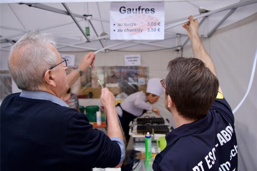 Bereits am frühen Morgen herrscht geschäftiges Treiben auf dem Escher Rathausplatz, als fleißige Helfer eifrig Zelte und Stände aufbauten, darunter auch der DT Esch Abol. Um 15 Uhr versammelt sich dann das gesamte Team um Präsident Laurent Kohl, um die letzten Vorbereitungen zu treffen. Waffeleisen, Dekorationen und Beleuchtung werden aufgerichtet, damit ab 16 Uhr die ersten Waffeln über die Theke gehen können. So dauert es auch nicht lange, bis der Stand die ersten Besucher anzieht, die die mittlerweile schon berühmten „Eisekuchen“ probieren wollen. „Es ist wirklich ein gutes Team und ein Team, das schon lange zusammenarbeitet. Wir machen das schon seit etwa 20 Jahren so“, erklärt Laurent Kohl stolz.