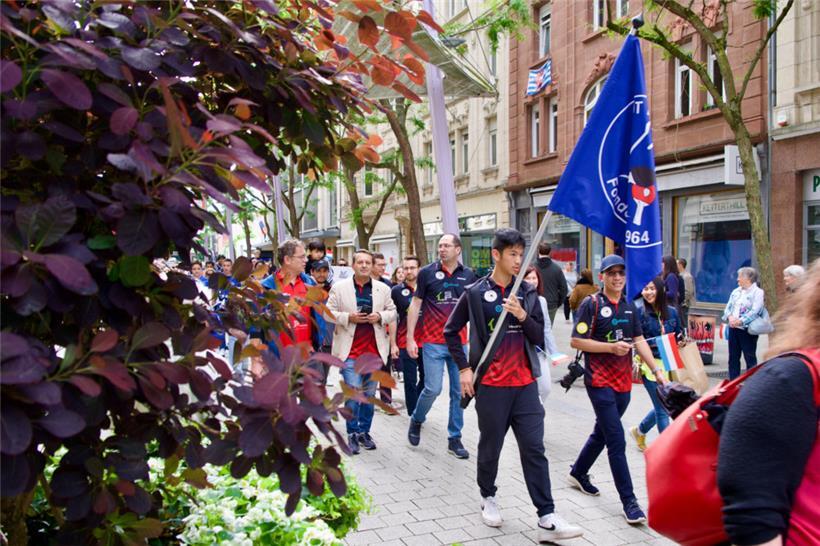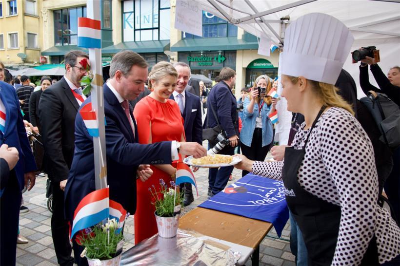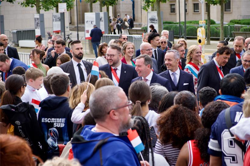 Pünktlich zu Beginn der Parade um 17 Uhr kommt dann endlich die Sonne zum Vorschein. Das erbgroßherzogliche Paar, Politiker und andere namhafte Luxemburger Repräsentanten machen sich gemeinsam mit zahlreichen Escher Vereinen auf den Weg vom Brill-Platz durch die belebte Fußgängerzone bis zum Rathaus. Zuschauer säumen den Weg und begrüßen die Teilnehmer mit Applaus und erhobenen Smartphones.