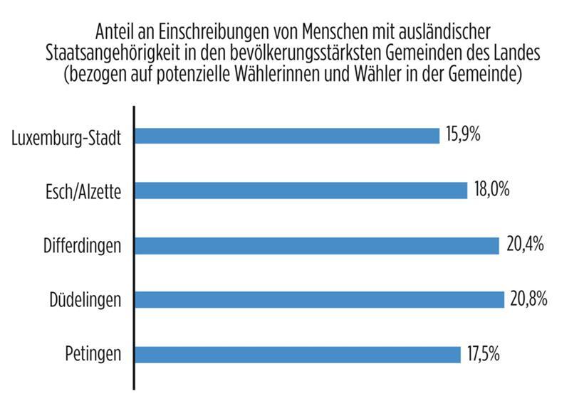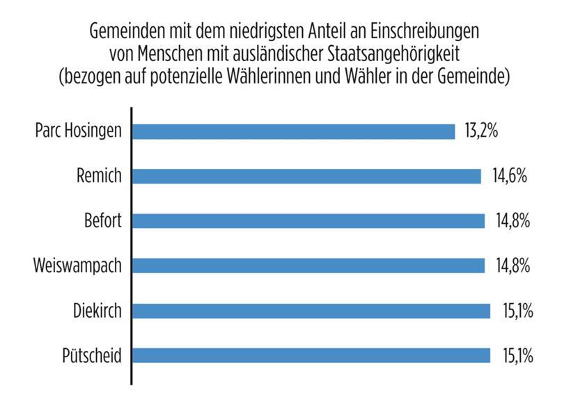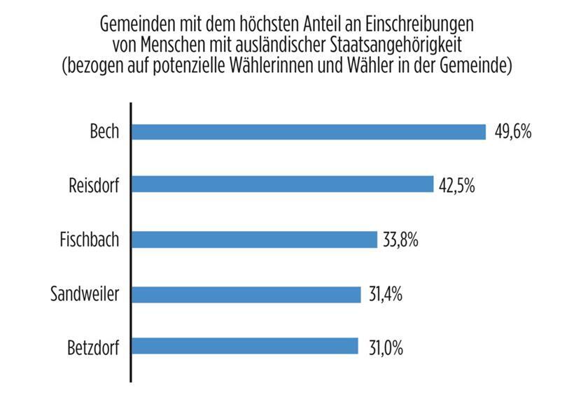Am meisten Menschen ohne Luxemburger Nationalität haben sich in der Gemeinde Bech eintragen lassen: mit 49,6 Prozent fast die Hälfte der potenziellen Wählerschaft. Es folgen Reisdorf (42,5 Prozent), Fischbach (33,8 Prozent), Sandweiler (31,4 Prozent) und Betzdorf mit 31 Prozent. Zu den Gemeinden mit den niedrigsten Anteilen gehören Parc Hosingen mit 13,2 Prozent, Remich mit 14,6 Prozent, dann Befort sowie Weiswampach mit je 14,8 Prozent und anschließend Diekirch sowie Pütscheid mit je 15,1 Prozent.