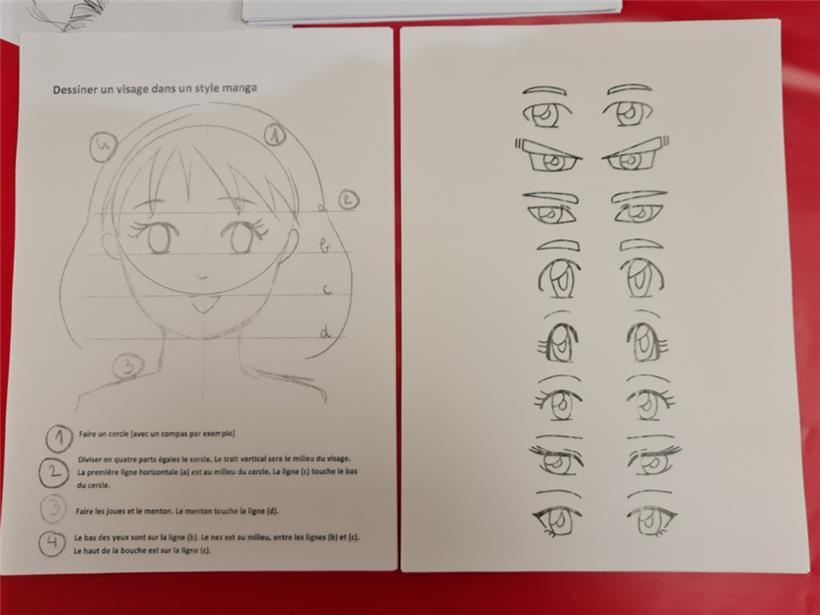 Die Grundtechniken beim Zeichnen einer Manga-Figur seien die gleichen wie bei einem Porträt, so die Künstlerin. Man beginne also zuerst mit einer groben Gesichtsstruktur. Am einfachsten gelinge dies mit einem Kreis, den man mithilfe eines Zirkels zeichne. Hilfslinien teilen das Gesicht in mehrere Abschnitte und helfen dann Ohren, Augen und Nasen korrekt zu platzieren, wie Ikuko vorführt. Für die ersten Versuche liefert die Künstlerin den Interessenten fertige Vorlagen von Augen.