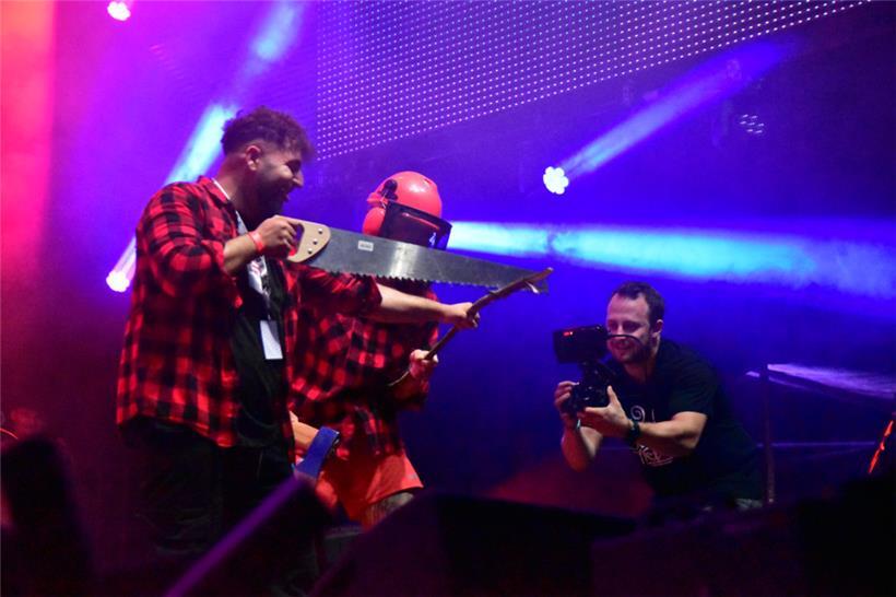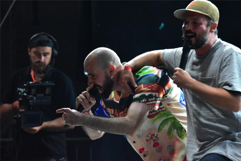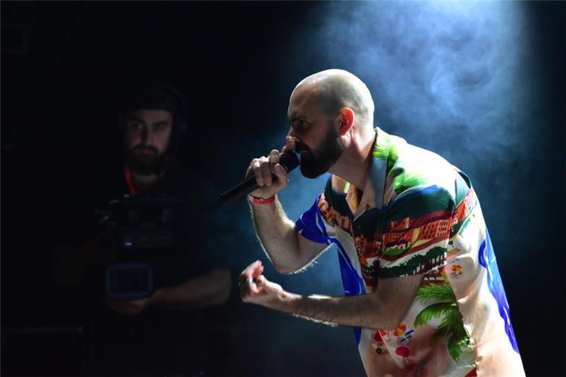 Während das Geschehen vor der großen Bühne zeitweise ins Anarchische kippte wie eine Horde Zehnjähriger im Colarausch (Wall Of Death! Wasserpistolen! Konfetti!), ging es nebenan etwas „intellektueller“ zu, wobei man auch zum vertrackten, polyrhythmischen Mathrock von Mutiny On The Bounty offensichtlich ziemlich gut „abgehen“ konnte – und Rapper Maz fesselte das Publikum mit literarischen Lyrics, die er wie wütender Derwisch zu konzentrierten Trap-Beats herausspuckte. Maz’ Lyrics und Botschaft sind der verzweifelte Aufruf, endlich die Masken und Schranken zwischen den Menschen herunterzureißen.