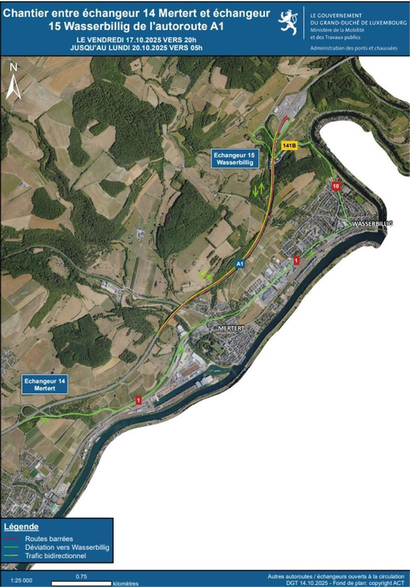 Im Zuge der Arbeiten muss die Ausfahrt Wasserbillig – die zugleich den Zugang zum Autobahnrasthof Wasserbillig in Richtung Trier ermöglicht – vollständig gesperrt werden. Eine Umleitung wird eingerichtet und ist entsprechend ausgeschildert. Verkehrsteilnehmende, die den Rasthof oder die Ausfahrt Wasserbillig nutzen möchten, werden ab der Anschlussstelle Mertert über die N1, N10 und den CR141B umgeleitet.