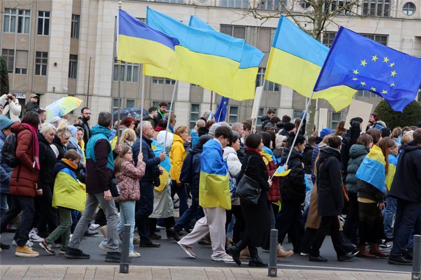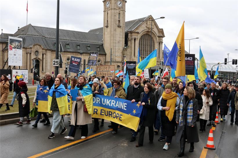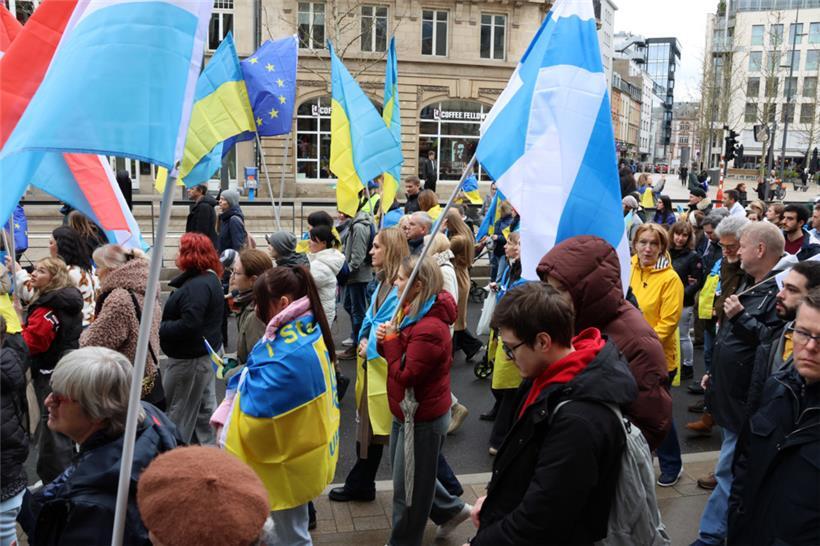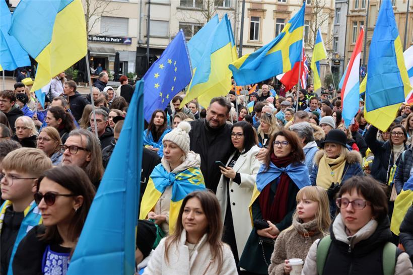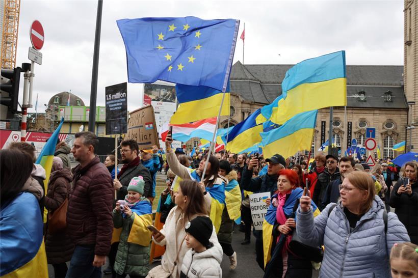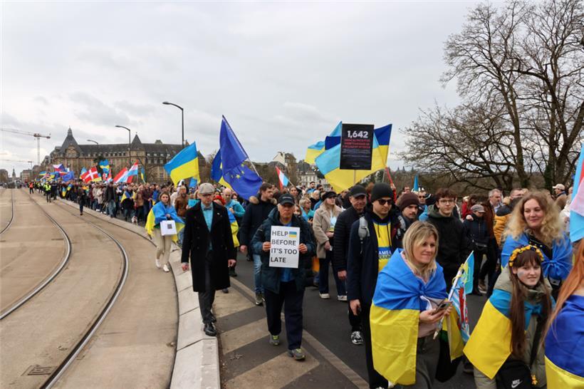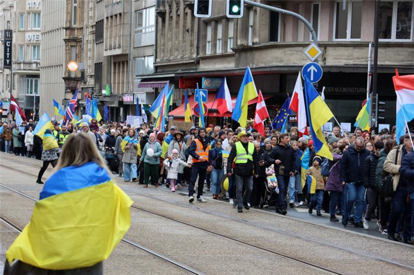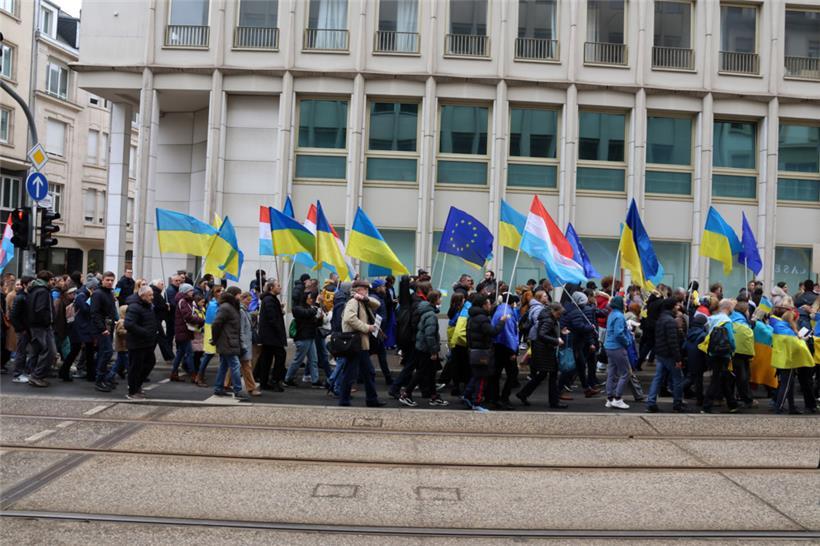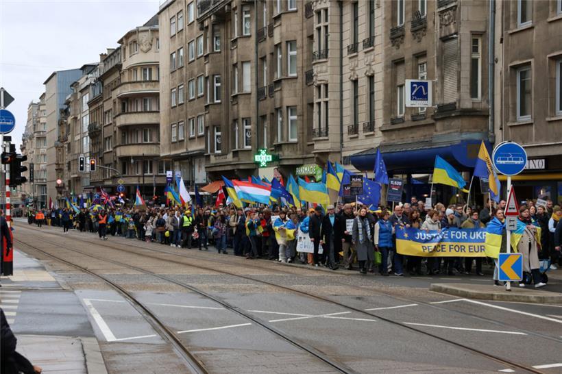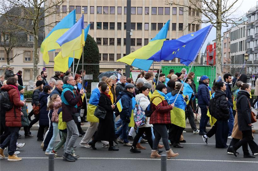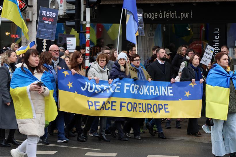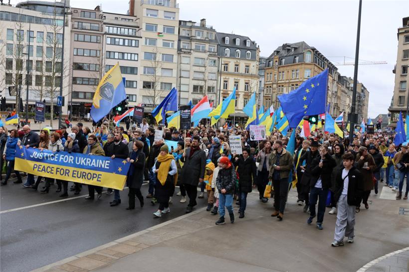 Unter dem Motto „Gerechtigkeit für die Ukraine – Frieden für Europa“ haben sich am Samstagnachmittag hunderte Menschen zusammengefunden, um am dritten Jahrestag des russischen Angriffskriegs in der Ukraine zusammen zu demonstrieren. Organisator des Solidaritätsmarschs, der um 14 Uhr am hauptstädtischen Bahnhof startete, ist die ASBL LUkraine. Man wolle die „dringende Notwendigkeit eines gerechten Friedens in Europa“ betonen, geht aus einer Pressemitteilung hervor.