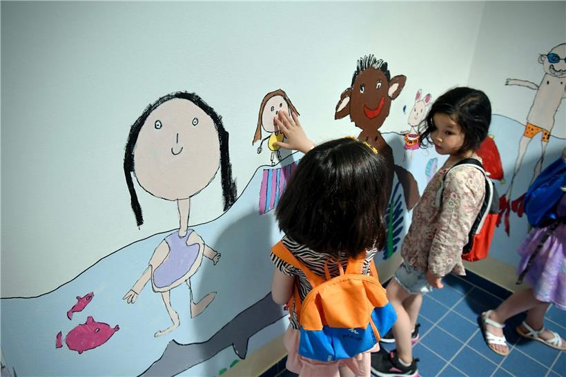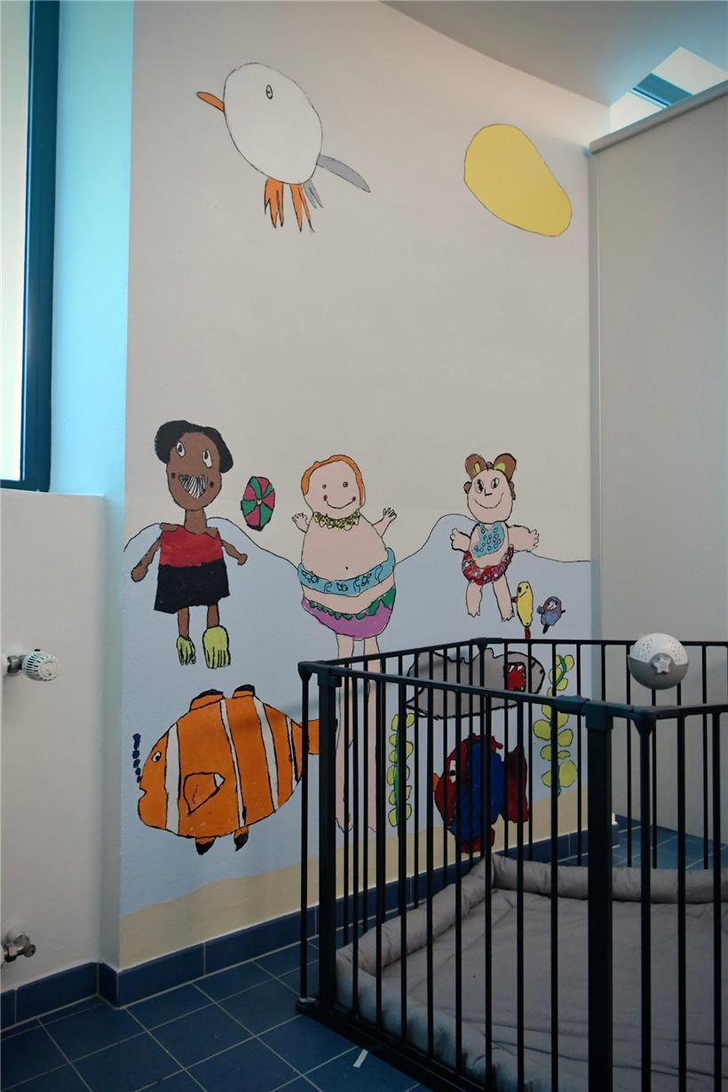 Farbtupfer: Die neue Familien-Umkleidekabine wurde von Kindern aus der Brill-Schule bemalt