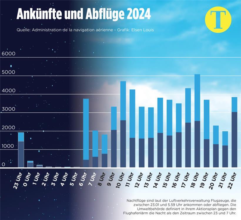 Der Zeitpunkt der Protestaktion ist nicht zufällig gewählt, denn am Samstag, dem 13. September, ist der internationale Tag für ein Verbot der Nachtflüge. Wilhelmy, der in Gasperich wohnt und regelmäßig durch den Fluglärm um den Schlaf gebracht wird, beschäftigt sich seit Jahren mit dem Thema. Die Nachtflüge nahmen in den vergangenen Jahren zu. 2024 waren es über 3.000, trotz offizieller Sperrstunde des Flughafens zwischen 23 und 6 Uhr. Besonders häufig fanden Starts und Landungen zwischen 23 und 24 Uhr statt. Zwei Drittel der Flüge entfielen auf Passagiermaschinen, ein Drittel auf Fracht.