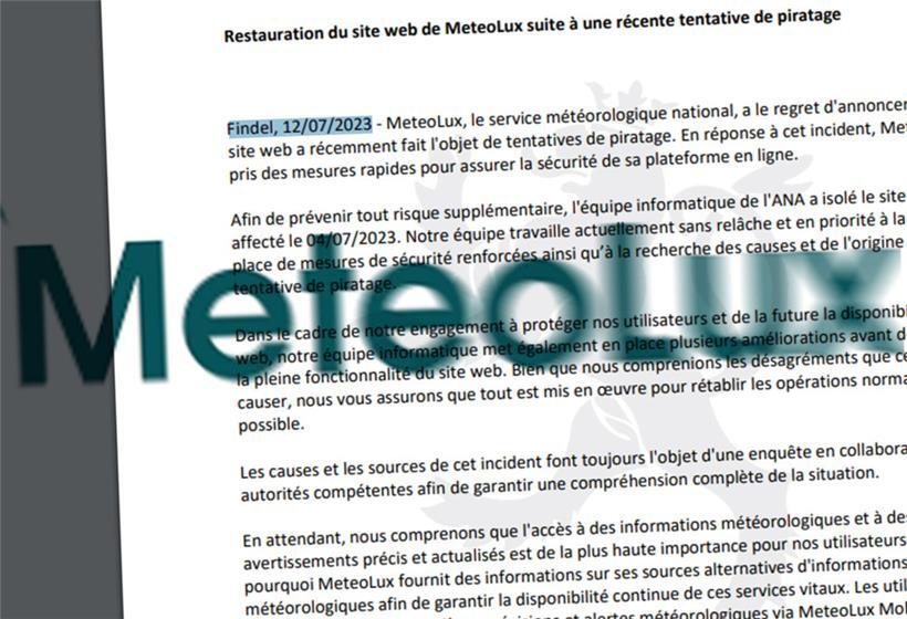 Dass der nationale Wetterdienst Meteolux Ziel von „Hackerversuchen“ geworden ist, wurde bereits vor einigen Tagen gemeldet. Am Montag (17.7.) ist eine neue Mitteilung dazu veröffentlicht worden – die allerdings auf den 12. Juli datiert ist und auch nur wenig über das hinausgeht, was bereits bekannt war.