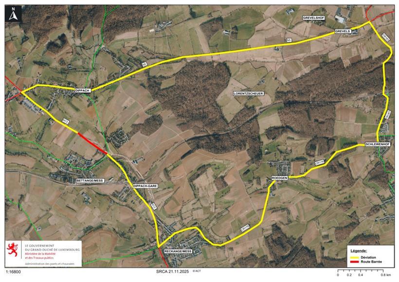 Im Rahmen der Arbeiten am Umgehungsprojekt Dippach-Gare wird die Nationalstraße N13 zwischen Dippach und Bettingen/Mess von Montag, 8., 8.00 Uhr, bis Freitag, 12. Dezember, 17.00 Uhr, gesperrt.