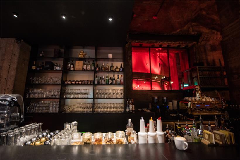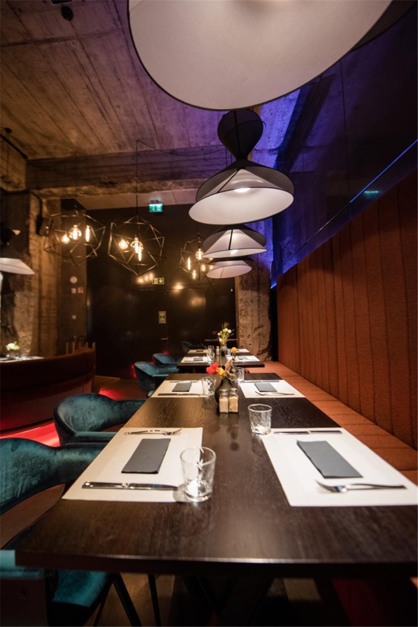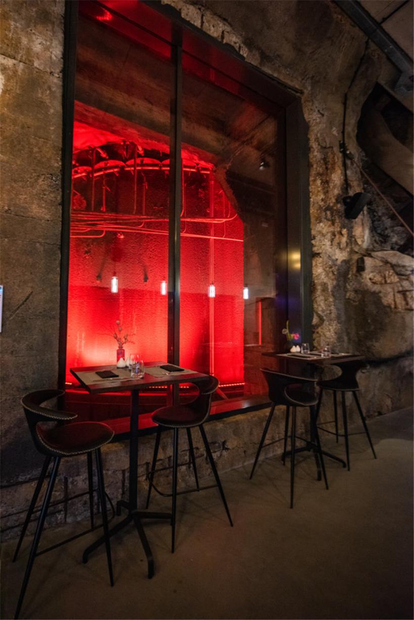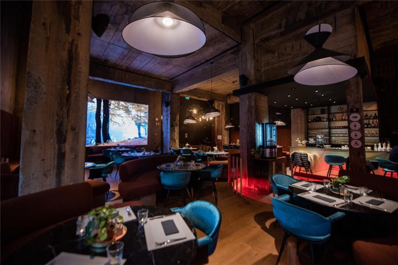 Das Lokal fällt vor allem durch seine Einrichtung auf: Die Industrieelemente des alten Gebäudes treffen auf warme, moderne Möbel. Beton und Stahl wird durch Stoff und Holz gebrochen. Ein rot beleuchteter Hochofen steht wie ein Ausstellungsstück hinter einem großen Fenster und alte Stahlschächte ragen aus der Mauer heraus. „Die Menschen kommen hier rein und sagen ‚wow‘“, so Vinkowski. Insgesamt 150 Gäste finden auf den Sesseln, Bänken und Stühlen Platz.