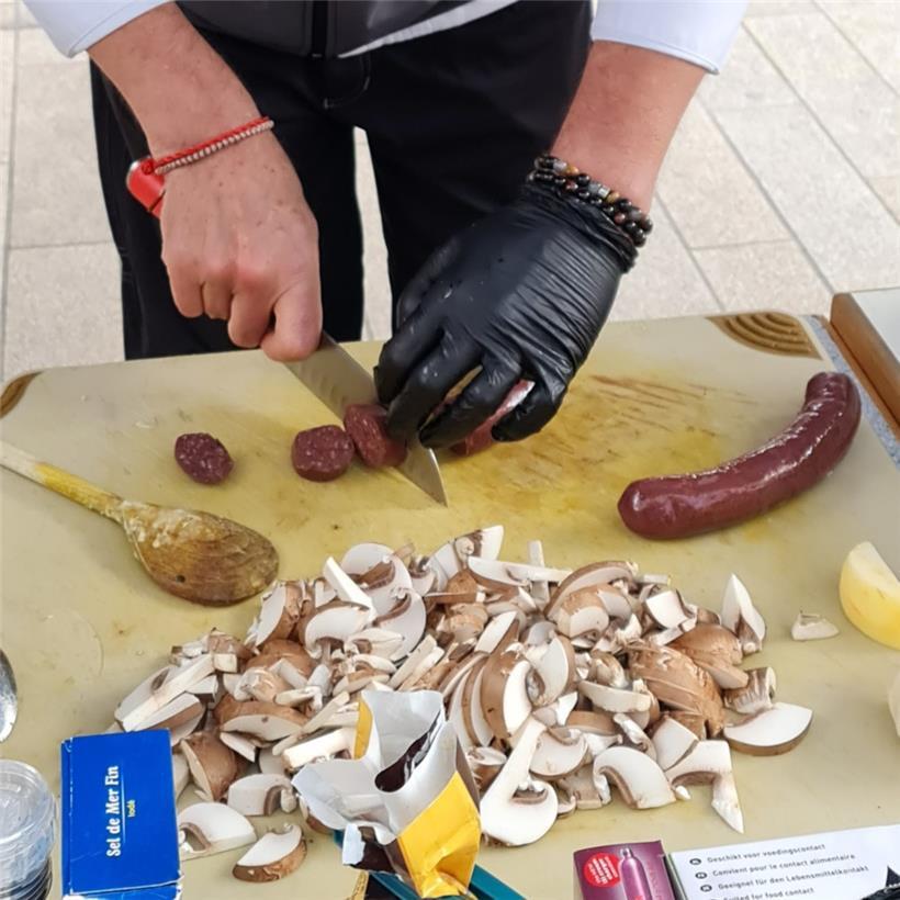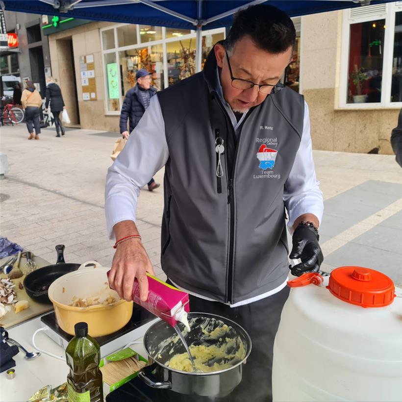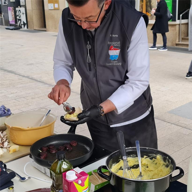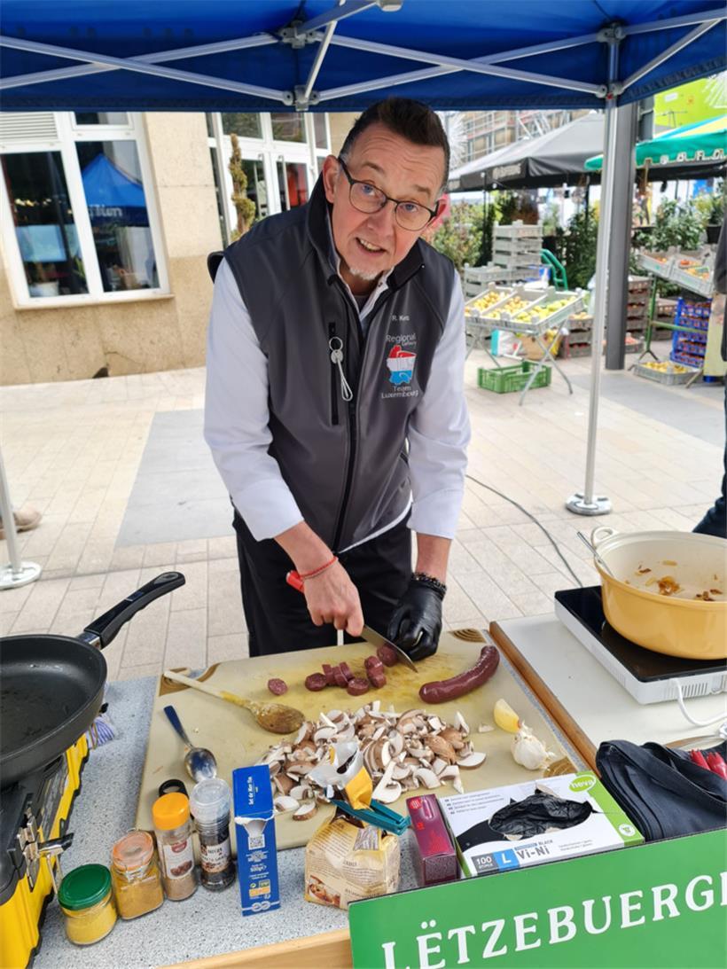 Wenn es beim Kochen mal wieder schnell gehen soll, greifen viele Menschen zum Fertiggericht aus der Tiefkühltruhe oder zu Konserven. Dennoch besteht die Möglichkeit, aus frischen, lokalen und saisonalen Lebensmitteln schnell eine leckere Mahlzeit zu kochen. Am vergangenen Samstag führte René Kertz, Mitglied der Luxemburger Koch-Nationalmannschaft, am „Stater Maart“ in Zusammenarbeit mit dem „Lëtzebuerger Maarteverband“ seine Kochkünste vor und zauberte binnen kürzester Zeit ein Zwei-Gänge-Menü.