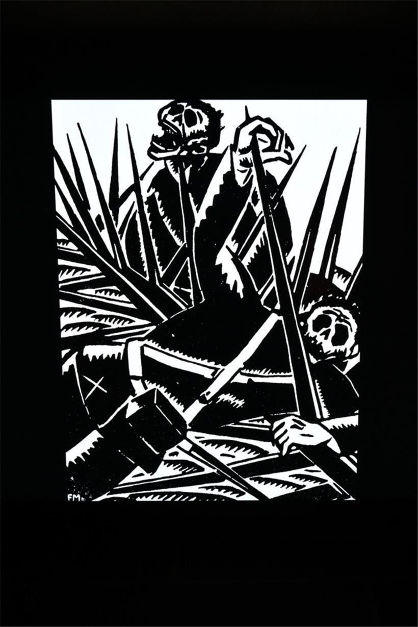 In dem Bild „Danse Macabre“, einem Antikriegszyklus aus 25 Zeichnungen, stellt ein Skelett die Hauptfigur dar. Es ist eine Allegorie auf den Tod, der die Menschheit heimsucht. Er tritt unter anderem als Bombenwerfer, Fallschirmspringer oder Panzerfaust auf. Auf dem Bild ist das Skelett ein Fahnenträger, der eine zum Kampf entschlossene Menschenmasse mit sich in den Abgrund führt. Masereel flüchtete während des Ersten Weltkrieges nach Genf, um dem Fronteinsatz zu entgehen. Hier begegnete er vielen geflüchteten Künstlern und Intellektuellen aus ganz Europa.