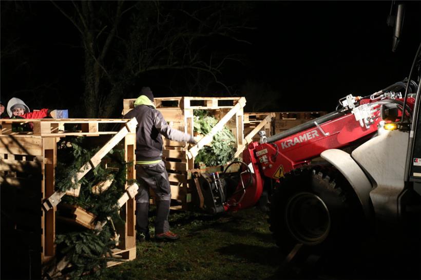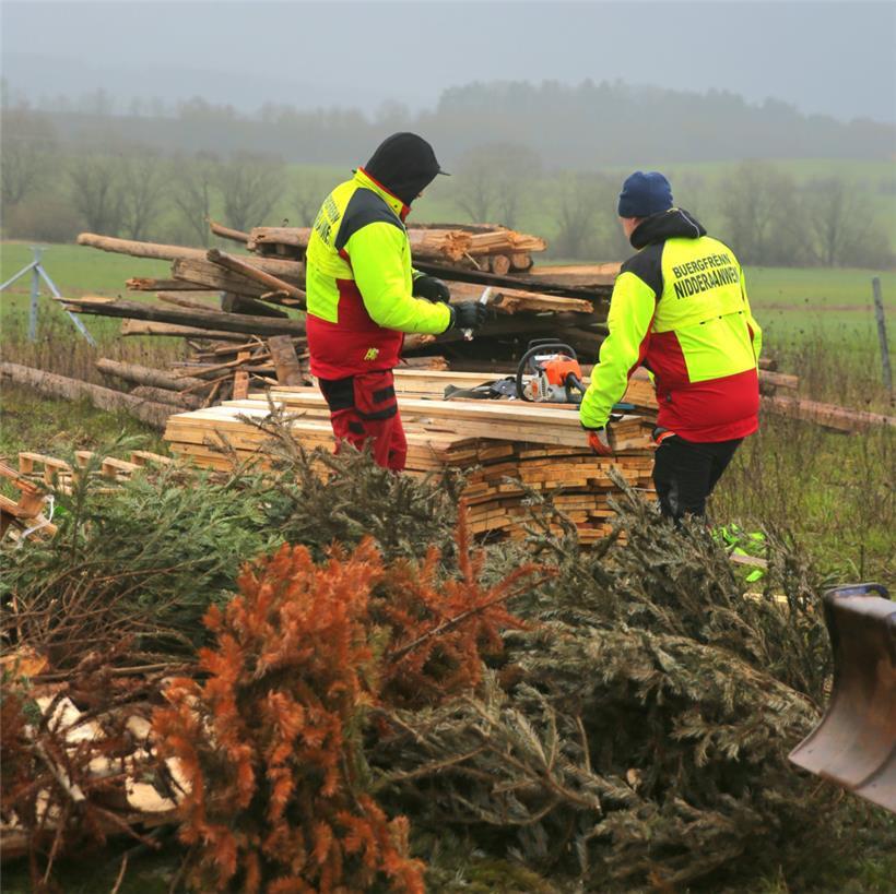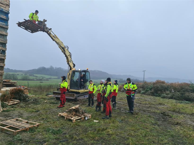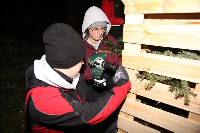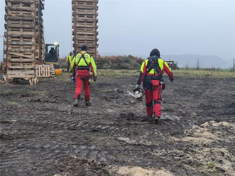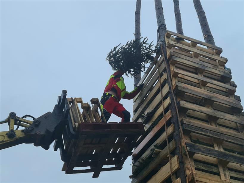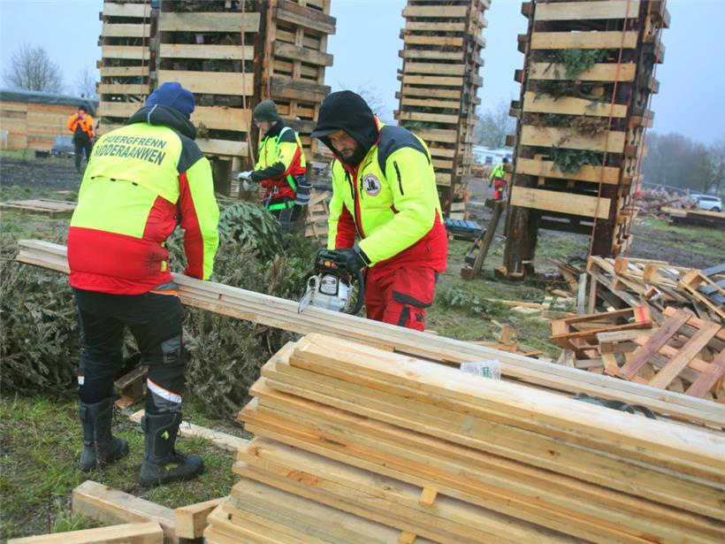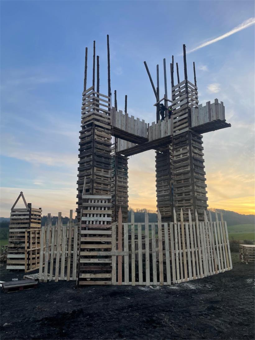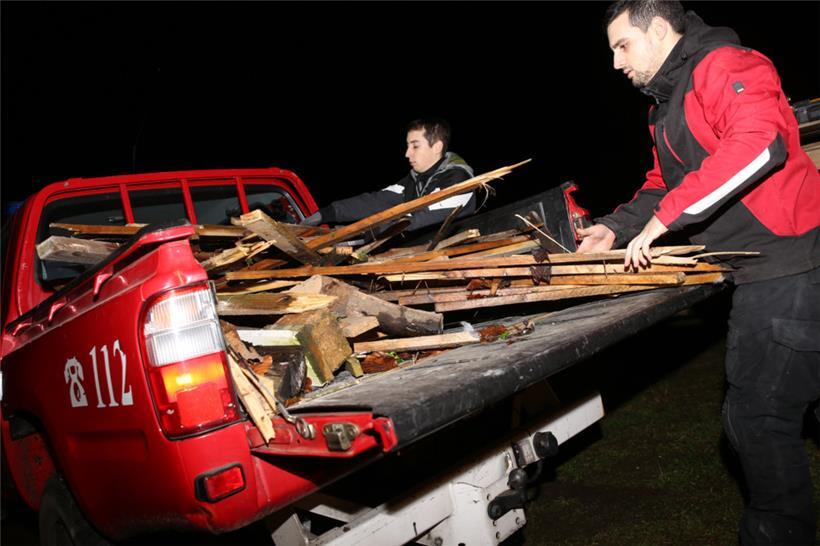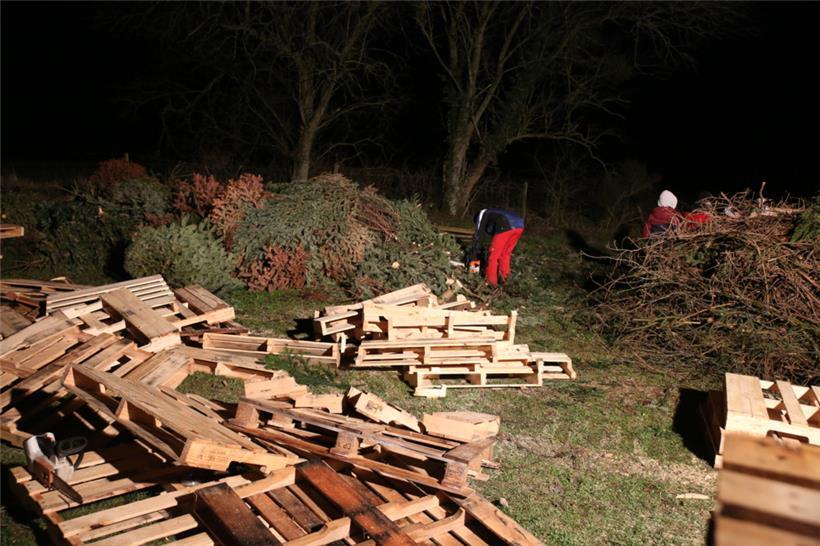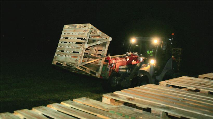 Das Grundgerüst besteht aus 40 mit jeweils vier Paletten geformten Kisten. Unter Scheinwerferlicht und mit jeder Menge Schrauben und Latten fertigen die emsigen Helfer die Kisten an. Am Freitagabend nach Feierabend und erneut unter Scheinwerferlicht geht es weiter: Jeder packt mit an. Während ein Team die ausgedienten Weihnachtsbäume und Paletten mit der Motorsäge kleinschneidet, befüllen andere Helfer die Kisten mit dem leicht brennbaren Material. Anschließend fährt ein Traktor die befüllten Plattenkonstruktionen zur Seite. Erst am kommenden Samstag werden diese dann zur „Buerg“ zusammengebaut.