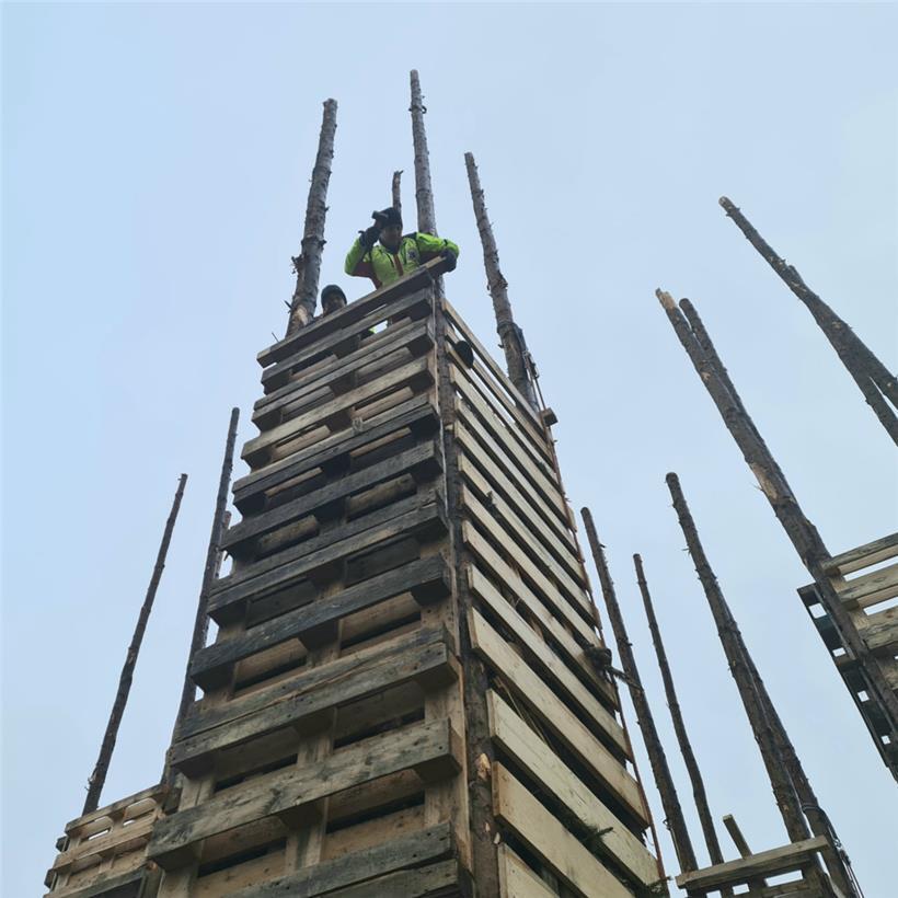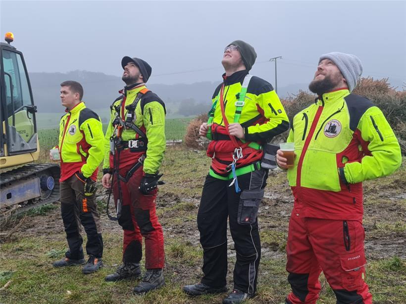 Das Thema Unfallvorsorge nimmt man in Niederanven sehr ernst. Immerhin arbeiten die Helfer in Höhen von bis zu etwa 20 Metern. Demnach sind die Leute mit einer persönlichen Schutzausrüstung, wie sie bei Höhenarbeiten am Seil zum Einsatz kommt, ausgestattet. Das Grundgerüst der Holzkonstruktion sind vier Türme, bestehend aus Fichtenstämmen und Paletten. Diese werden schichtweise mit Weihnachtsbäumen und vorzugsweise Nadelholz befüllt. Anschließend werden die vier Türme mithilfe der Bauhölzer und weiterer Fichtenstämme untereinander verbunden. Dabei entstehen stabile, begehbare „Brücken“, die ihrerseits an eine echte Festungsanlage erinnern.