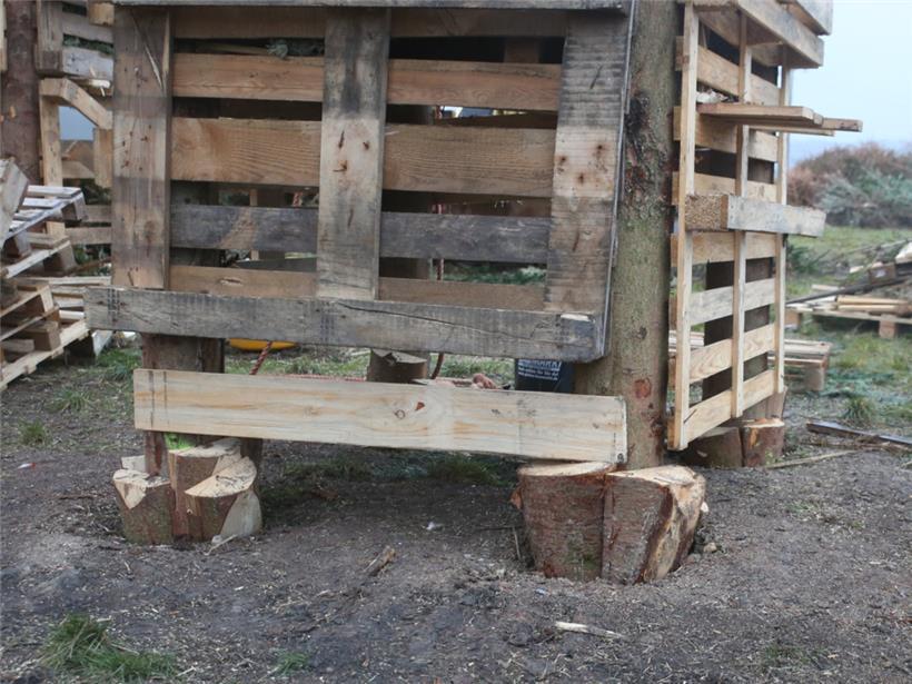 Etwa drei Monate im Voraus beschaffen die Burgfreunde das Material, sprich Paletten, Holz, Schrauben, Nägel und Gerätschaften. Doch dieses Jahr gilt es eine besondere Herausforderung zu meistern, so der Schriftführer Ben Milmeister: Man habe nur 1.500 Einwegpaletten erhalten, sonst waren es um die 4.000 bis 4.500 Stück. Dies liege aber nicht unbedingt am schlechten Willen der Unternehmer, sondern an der Tatsache, dass die Einwegpaletten gewinnbringend an Pellethersteller veräußert werden, erklärt Milmeister. Jedoch hält das Fehlen einiger Paletten die Burgbauer nicht von ihrem Vorhaben ab. Als Ersatz für die fehlenden Paletten gelang es den eifrigen Konstrukteuren, genügend Baumstämme, Kanthölzer, Bretter und Konstruktionsholz zu besorgen.
