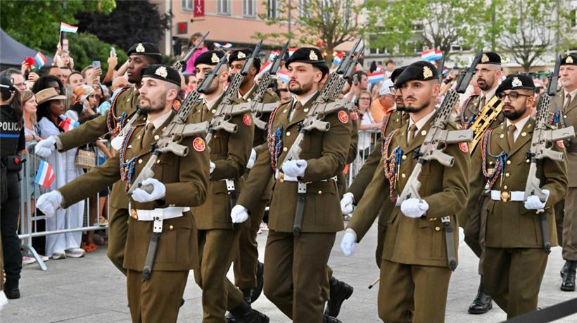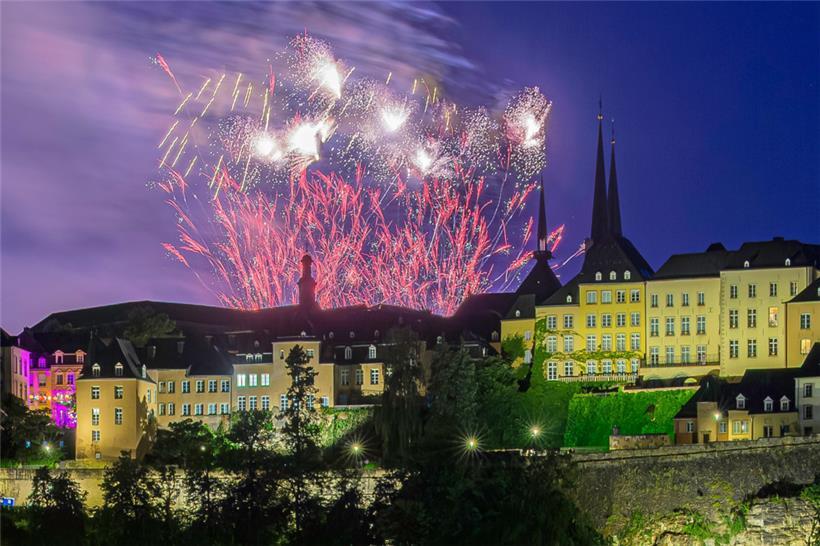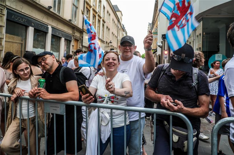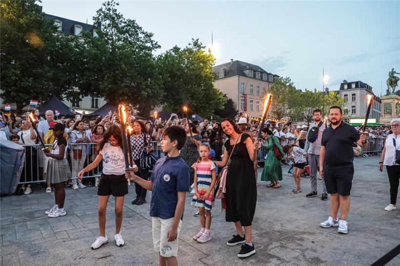 Ausgelassene Stimmung in der Kapitale: Am Vorabend zum Nationalfeiertag haben sich Tausende Menschen in den Straßen von Luxemburg-Stadt eingefunden. Das offizielle Programm begann schon um 16.00 Uhr mit der traditionellen Wachablösung vor dem großherzoglichen Palais. Um 21.30 Uhr traf der Großherzog dann auf der Ehrentribüne am Knuedler ein. Gleichzeitig marschierte der Fackelzug bei der place du Théâtre los. Die Fackelträger zogen von dort an der Ehrentribüne vorbei und in Richtung place Clairefontaine.