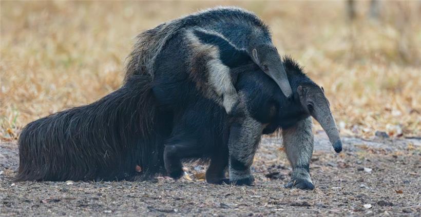 Im nördlichen Pantanal findet man vielerorts Termitenbauten. Und genau dort befindet sich das Habitat des Ameisenbären. Wir fuhren beim ersten Tageslicht los, um die besten Chancen auf eine Sichtung zu haben. Ein Muttertier mit seinem Jungen zu erwischen ist reine Glückssache. Wir waren insgesamt dreimal morgens unterwegs. Am letzten Tag konnte ich mein Glück kaum fassen. Aufgenommen mit dem Zoom 20-70mm bei 62mm. Näher geht kaum. Die Ameisenbären sind an Fahrzeuge gewöhnt und beachten sie nicht. Aussteigen würde sie aber in die Flucht schlagen.