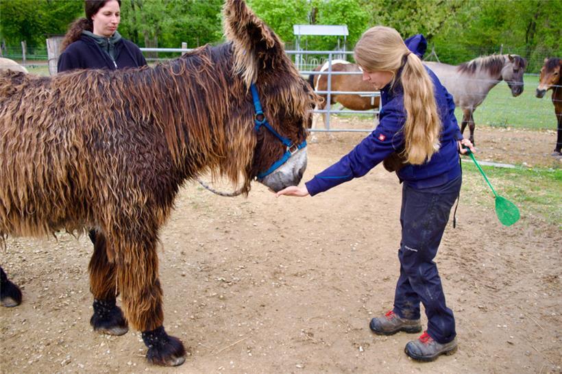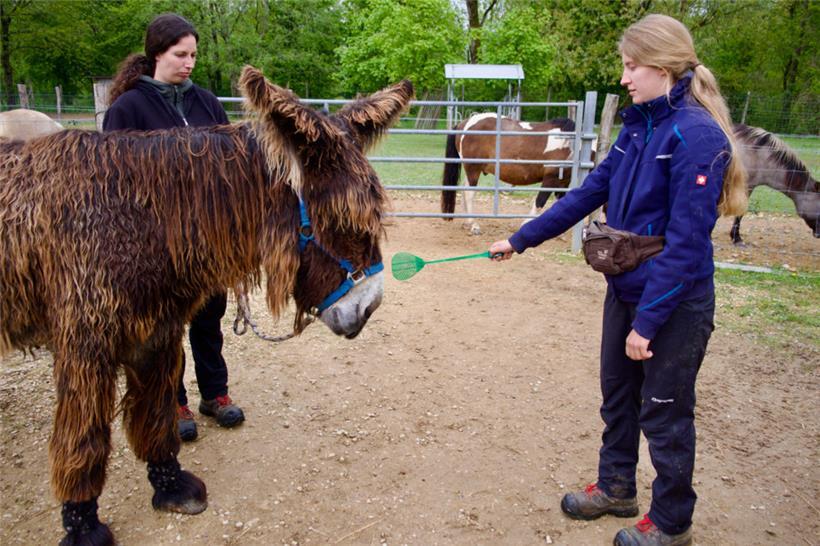 Eine Tierpflegerin beim Target-Training mit einem der Esel – jede Berührung der Fliegenklatsche wird belohnt Foto: Carole Theisen