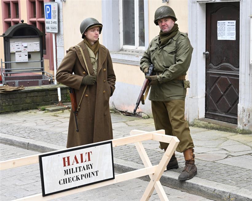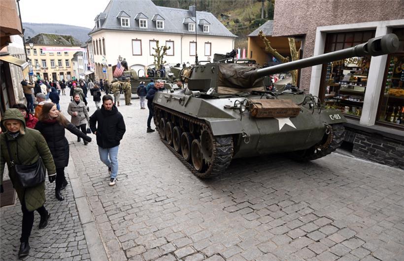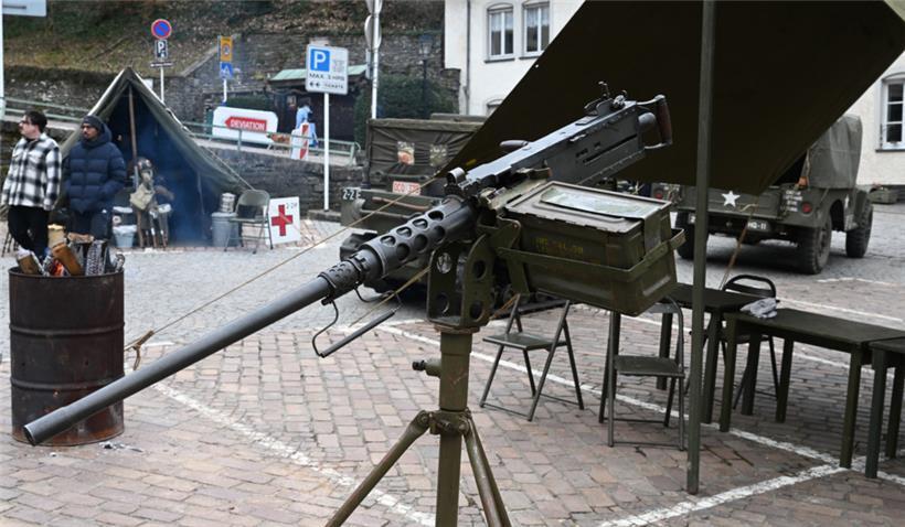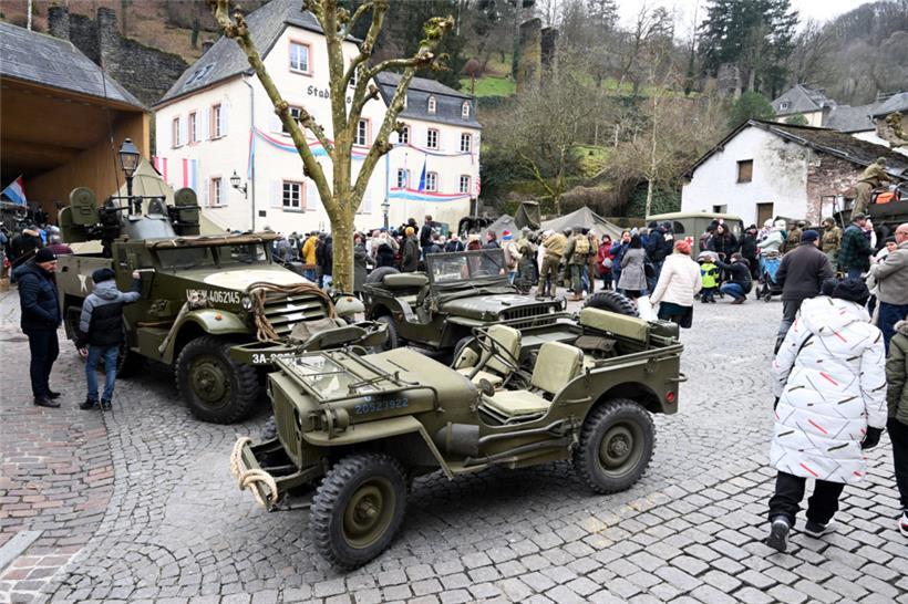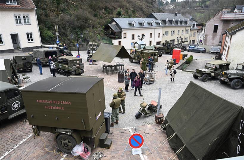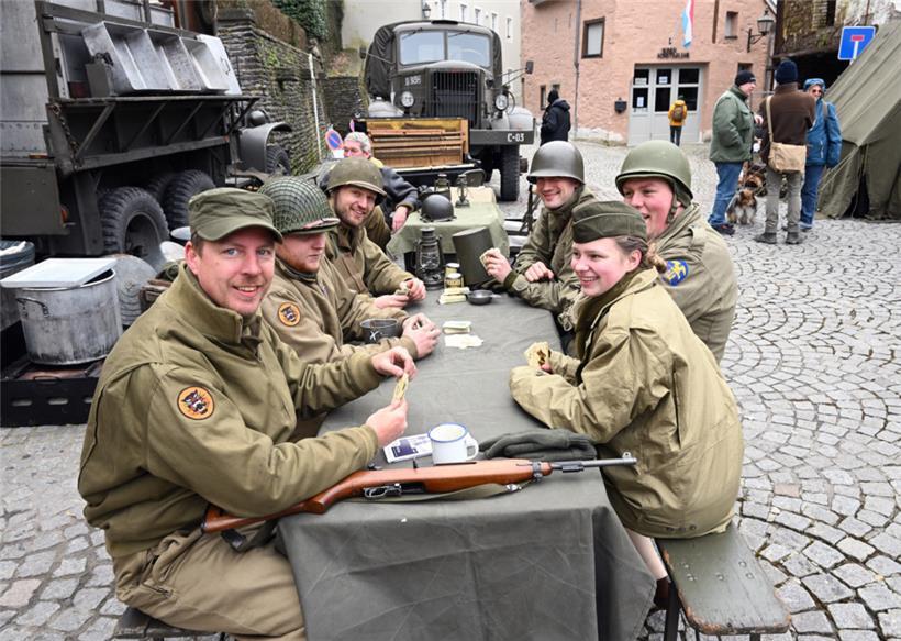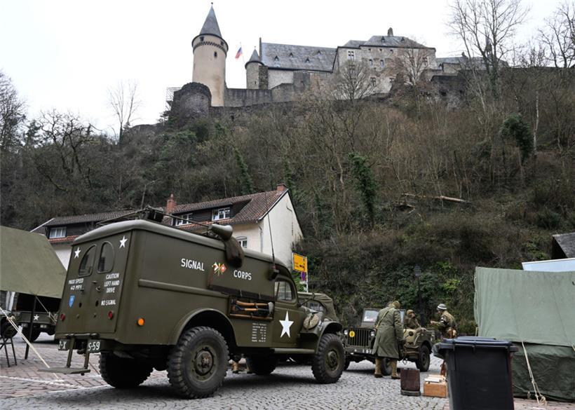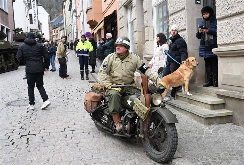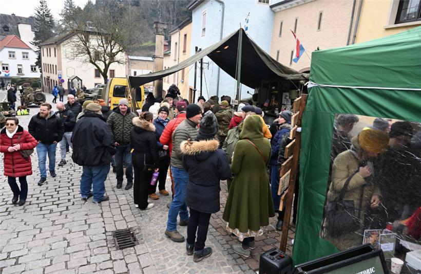 An dieses historische Ereignis vor 80 Jahren wird seit vergangenem Mittwoch in Vianden in vielfältiger Weise erinnert, besonders am Wochenende. Militärfahrzeuge rollen durch die Straßen, über die Our wurde eine Pontonbrücke errichtet und Uniformierte flanieren durch die Stadt. Auch verschiedene kleine Lager mit Zelten und militärischem Gerät sind aufgebaut, besonders auf dem Platz vor dem Rathaus. Es gibt Hamburger und Erbsensuppe aus der Feldküche – und Glühwein, angesichts der Kälte keine schlechte Wahl. Am Sonntagmorgen fallen sogar ein paar Schneeflocken. Während der letzten Kriegstage vor 80 Jahren war es noch kälter, erzählt eine Frau: „minus zehn Grad“.