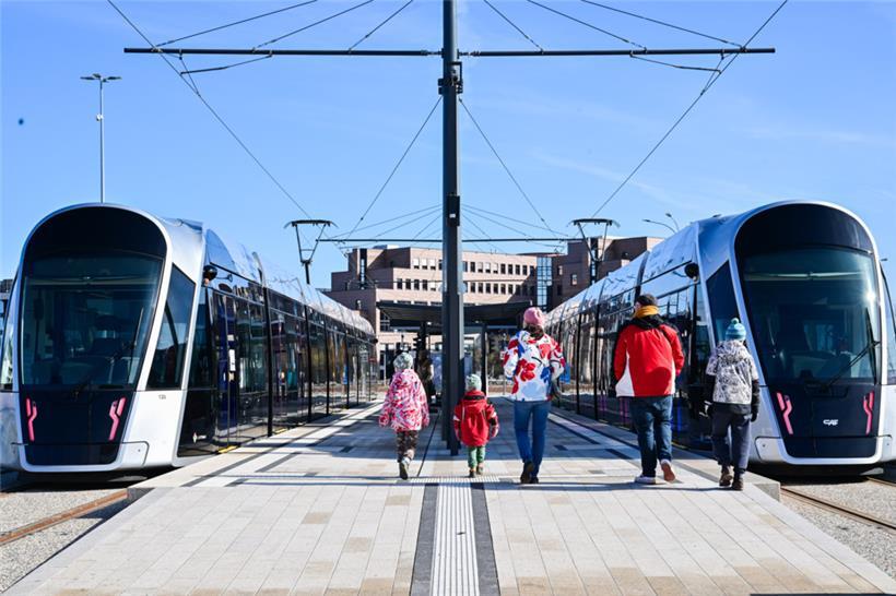 Normalerweise würde die meisten am Sonntagmorgen wohl noch nichts auf Kirchberg ziehen, höchstens ein neuer Brunch-Spot, den gibt es hier heute allerdings nicht. Für die allererste Fahrt der Tram zum Findel sind dennoch viele erschienen, denn eine Privattour auf Schienen erhält man nicht alle Tage. Verkehrsministerin Yuriko Backes, Stadt-Bürgermeisterin Lydie Polfer, Mobilitätsschöffe Patrick Goldschmidt, Luxtram-Direktor Helge Dorstewitz – sie alle schütteln fleißig Hände und rätseln gebannt, wo wir denn jetzt einsteigen. Das heutige Ziel: mit der Tram bis zum Flughafen fahren, so wie es künftig Reisende und Touristen vom Stadtzentrum aus tun können.
