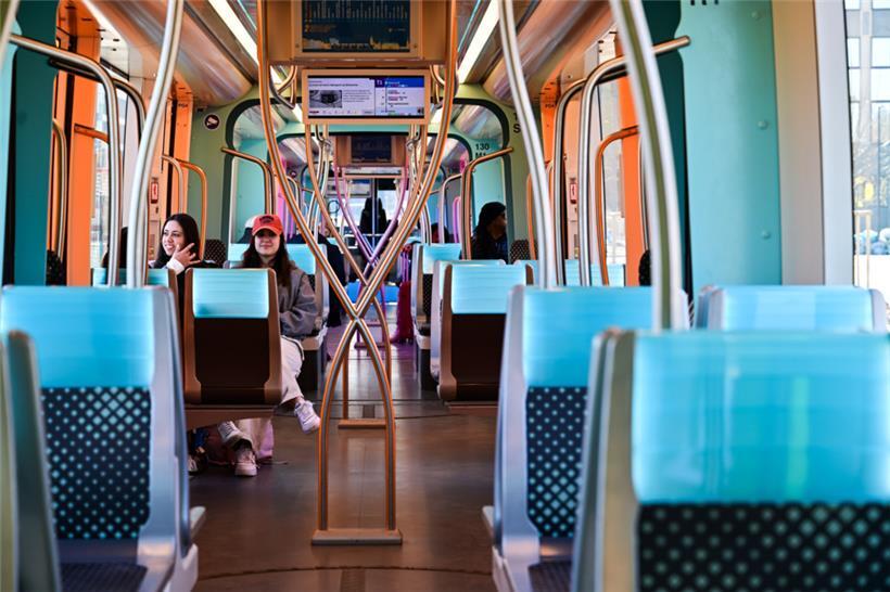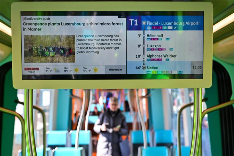 Es ist zwar sonnig, aber kalt draußen, sodass kurz nach 10 Uhr alle ins Tram-Innere drängen, um sich dort an einem idealerweise guten Platz mit Sicht nach draußen die Hände zu wärmen. Um 10.12 Uhr geht es dann endlich los. „The real deal“ ist die allererste Fahrt zum Findel noch nicht, denn erst mal wird die Haltestelle Héienhaff P+R übersprungen. Auch das Mural des „Lycée des arts et métiers“ erblicken die meisten Fahrgäste nicht – mit Presse, Politik und geladenen Gästen ist die Tram einfach zu voll.